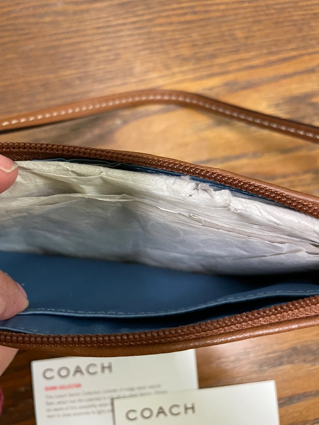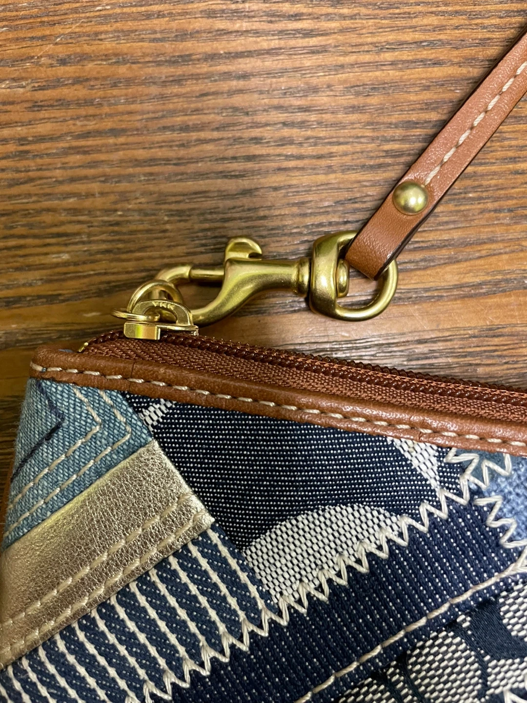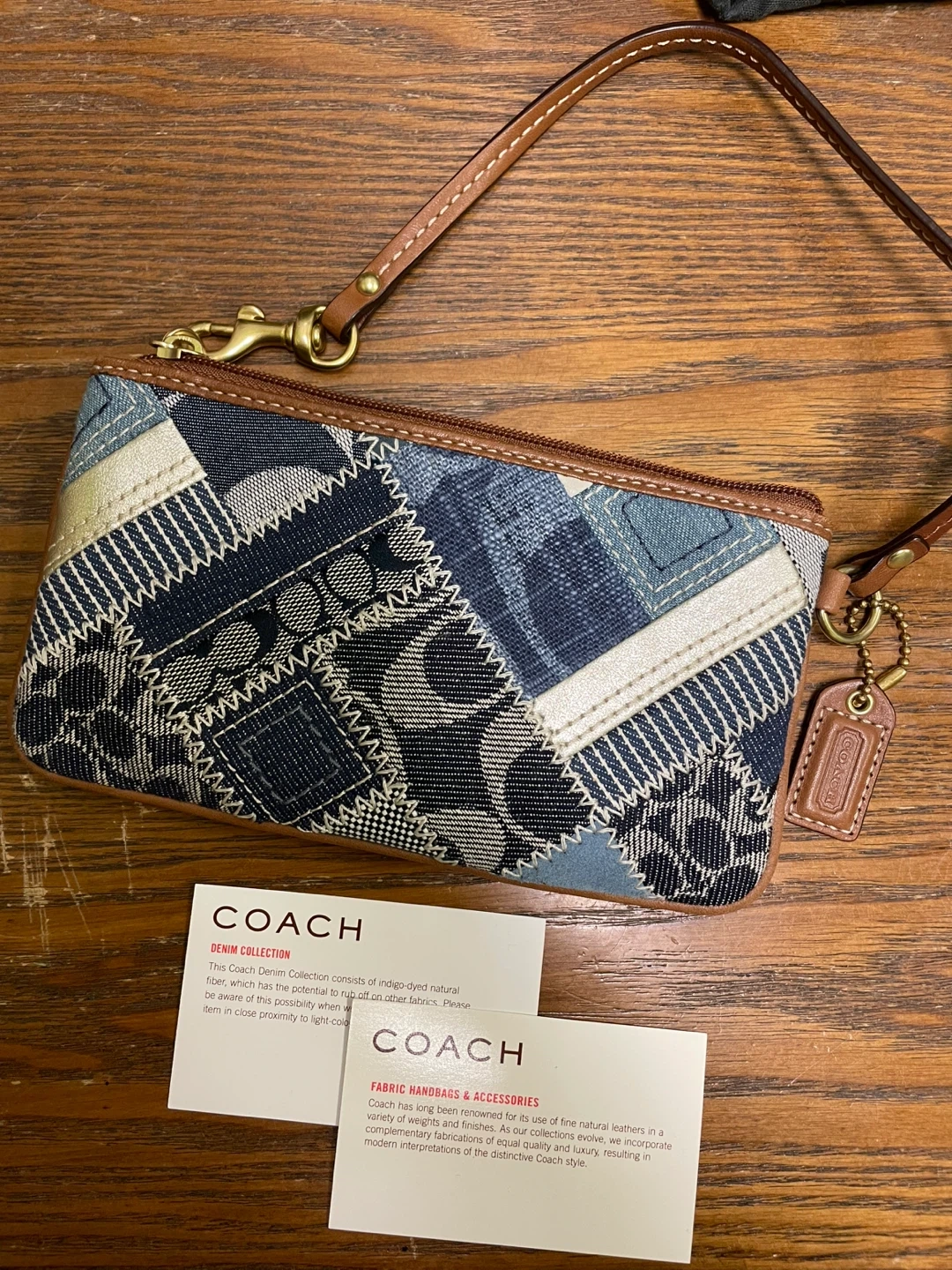 This Coach wristlet is from the denim collection! It features a patchwork design with indigo-dyed natural denim. The wristlet has a leather strap and a zipper closure. It's perfect for carrying your essentials!