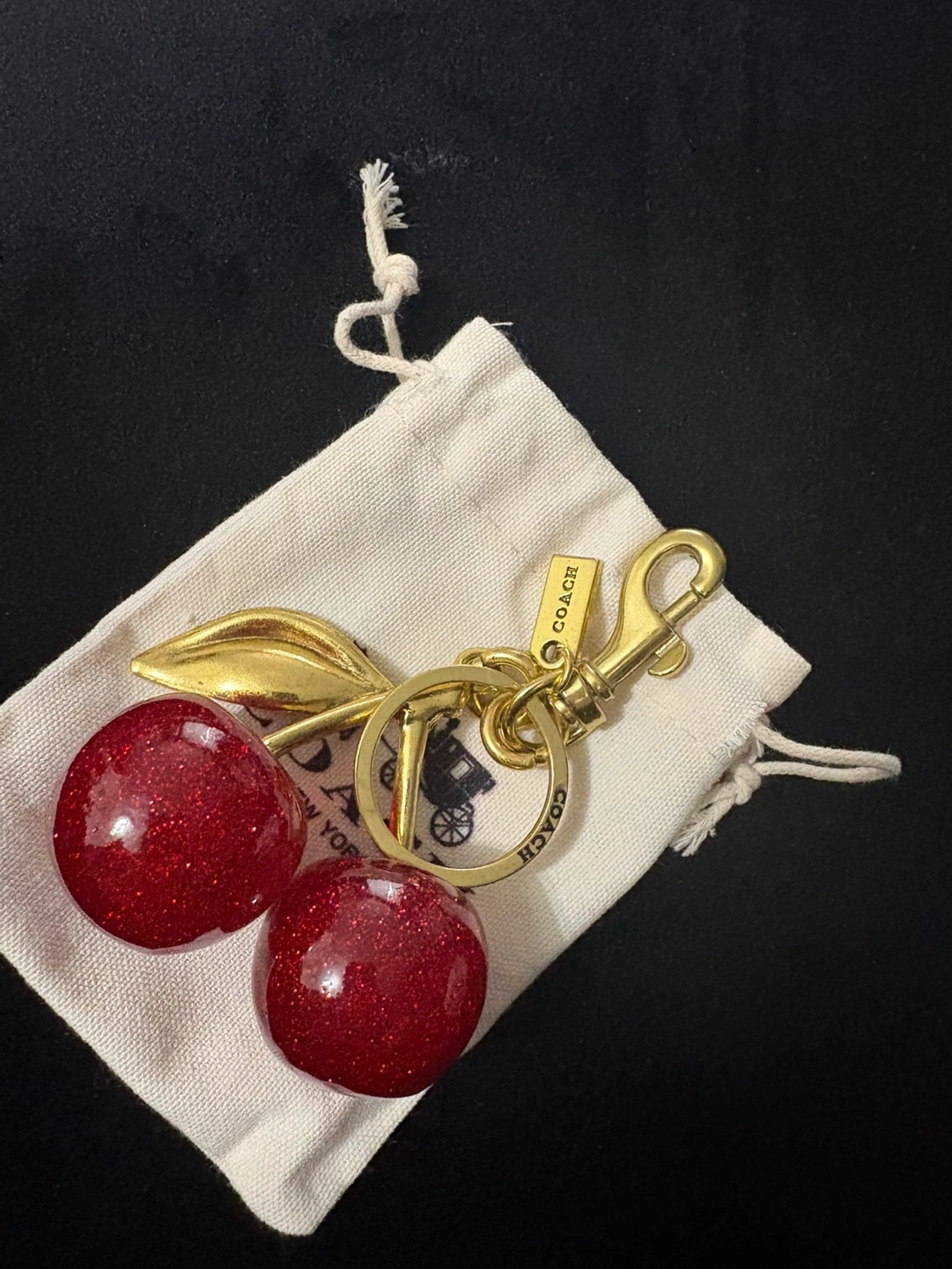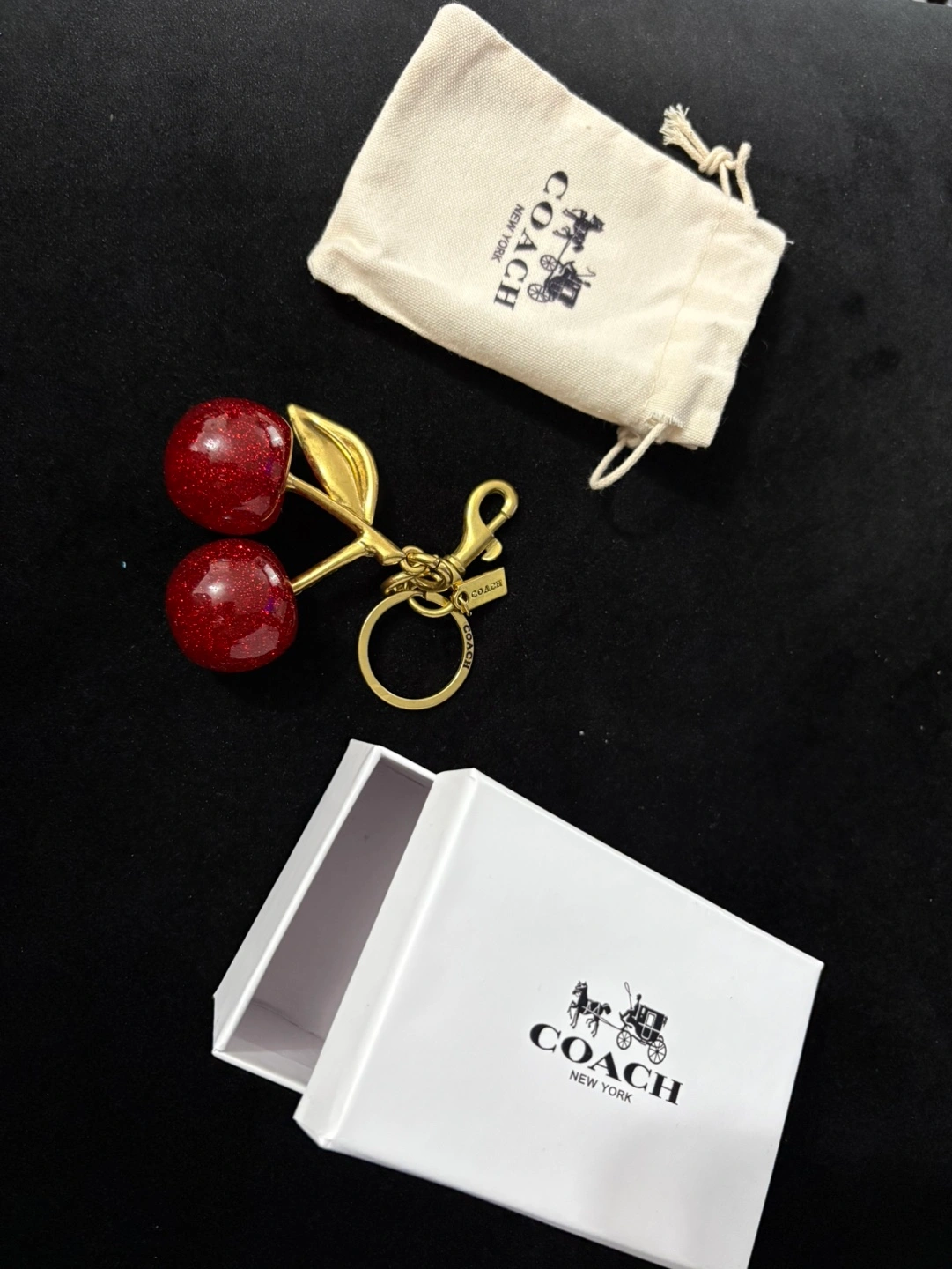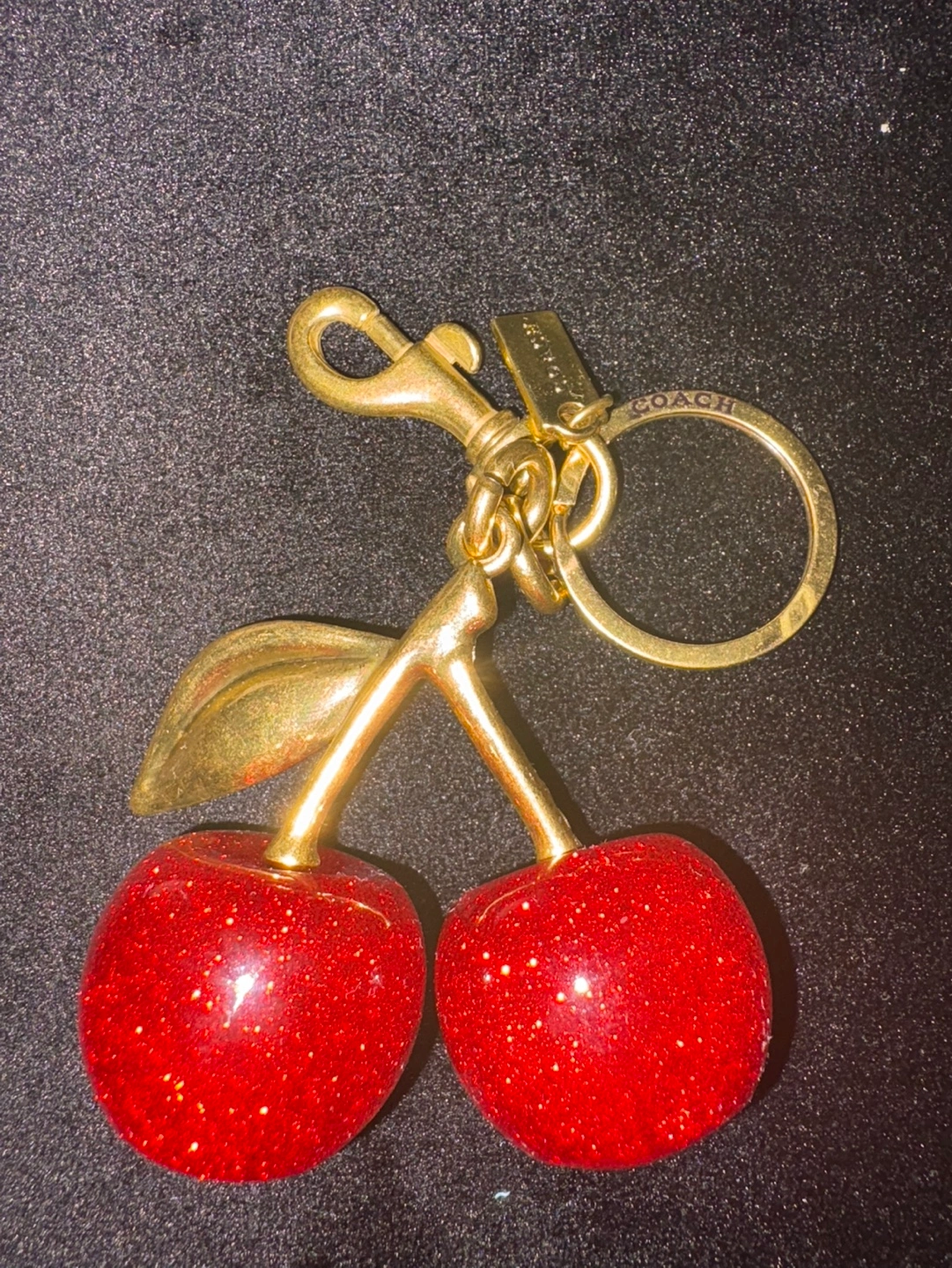 Adorable COACH keychain. Features two sparkly red cherries and a gold-toned clasp. Includes original box and dust bag. Perfect gift or accessory.