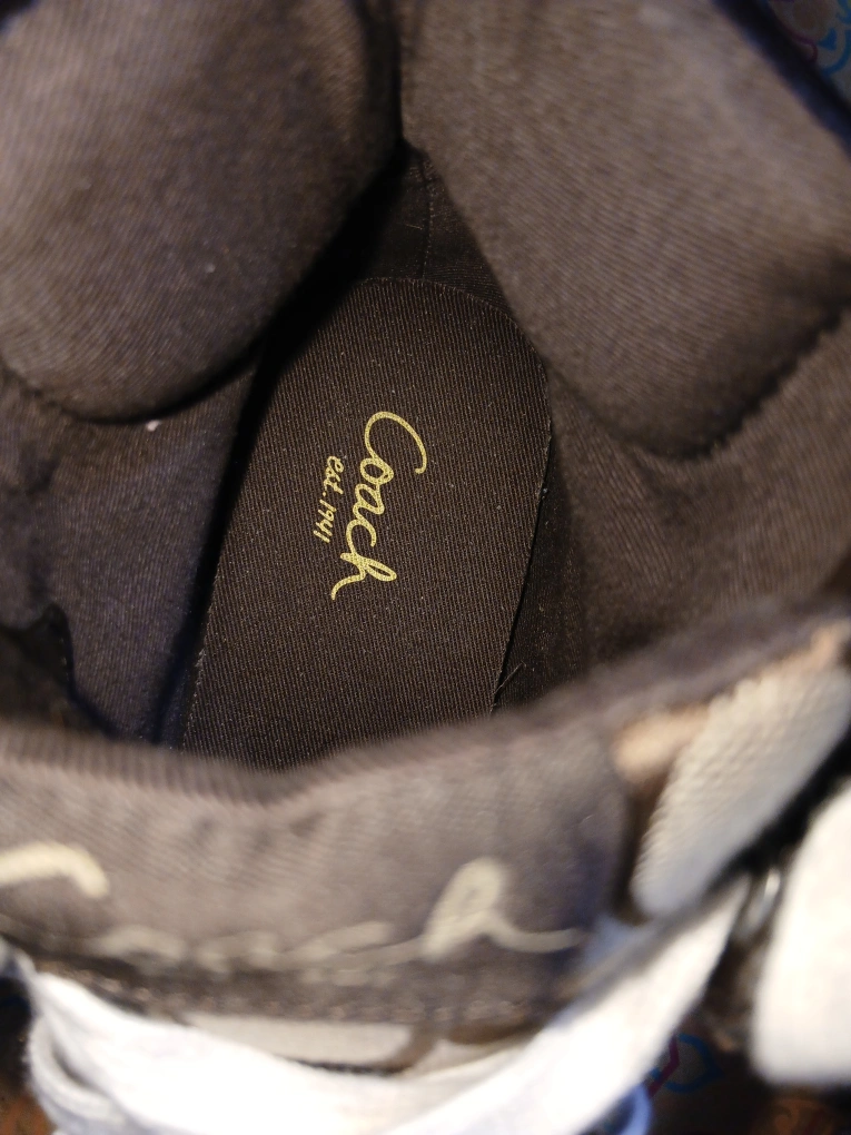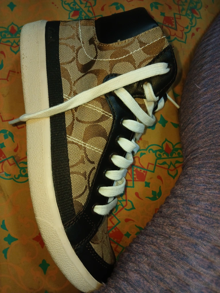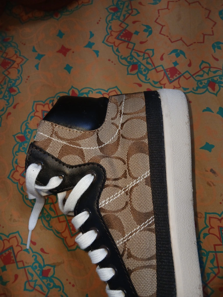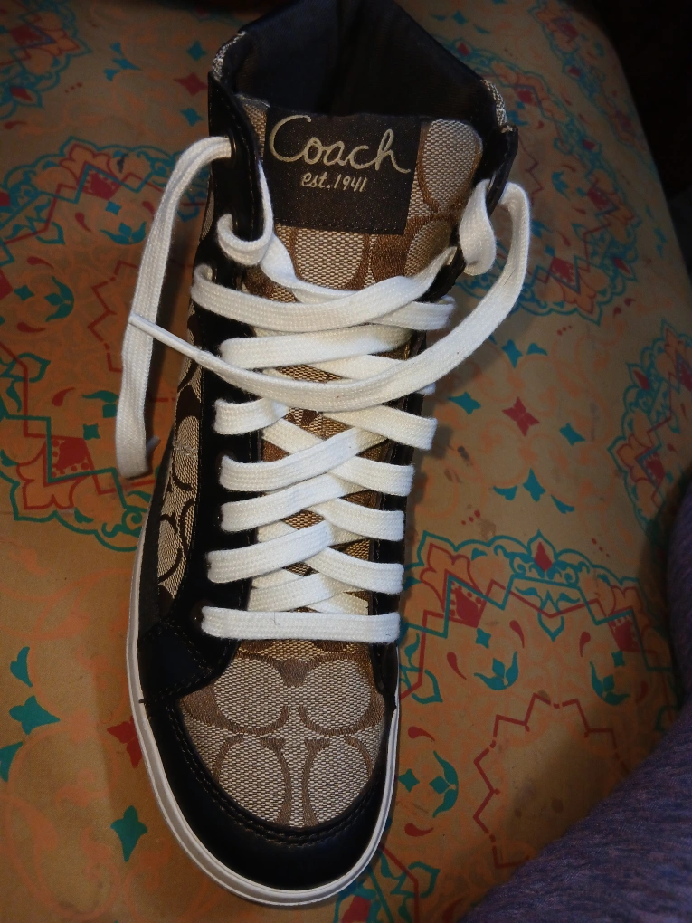 Selling a pair of Coach high top sneakers! They feature a brown and black design with the Coach logo pattern. Great for a stylish and casual look!