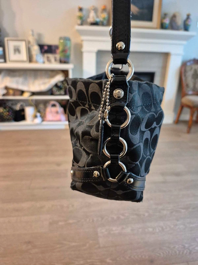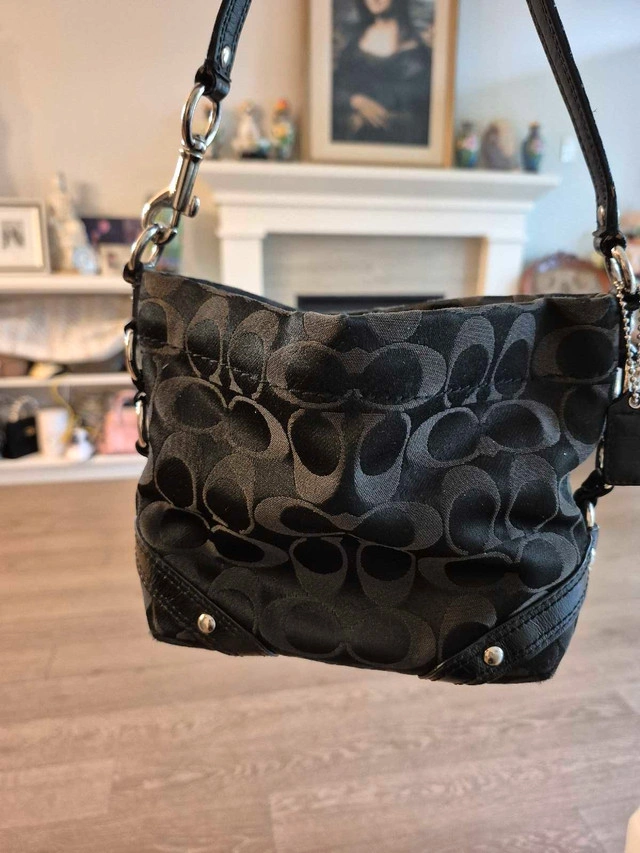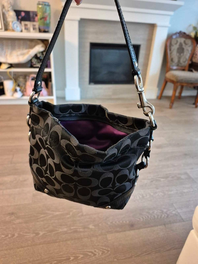 This is a used Coach black signature hobo bag with a black leather strap and silver hardware accents, perfect for everyday use. The interior is purple. It's in good condition, showing some signs of wear but has lots of life left! It's a stylish bag and ready for a new owner! * Brand: Coach * Style: Hobo Bag * Colour: Black with silver hardware * Material: Signature fabric with leather trim