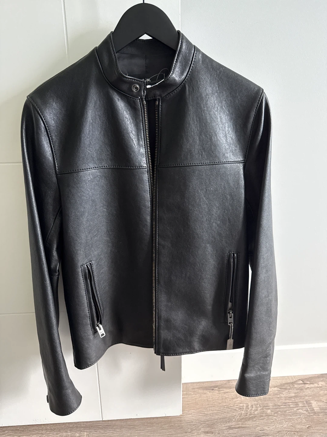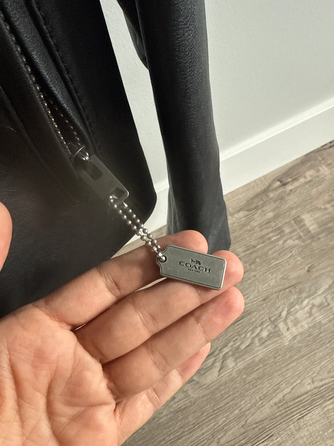 Selling a Coach Leather Racer jacket in black, size XS. It's in great condition and ready for a new home! The MSRP tag shows $995.00.