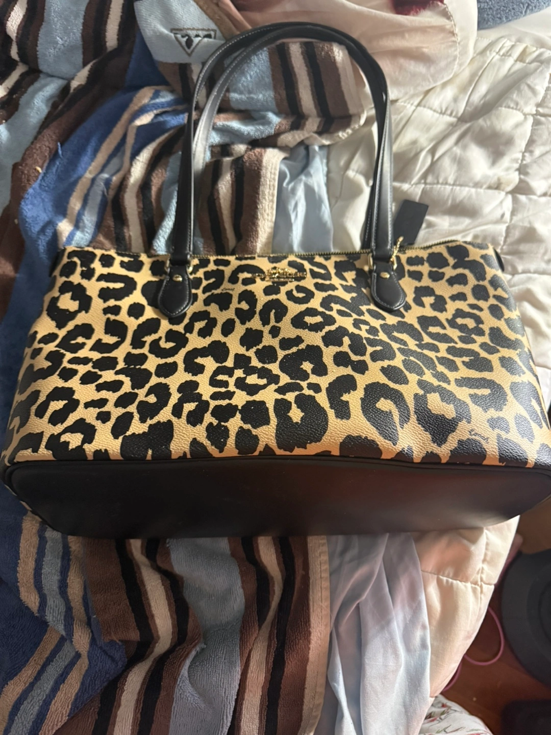 Large tote bag. Leopard print design. Black leather accents. Two top handles. Zip closure.