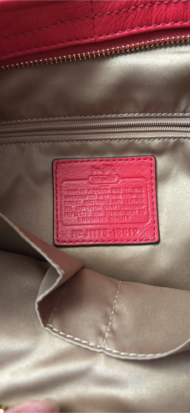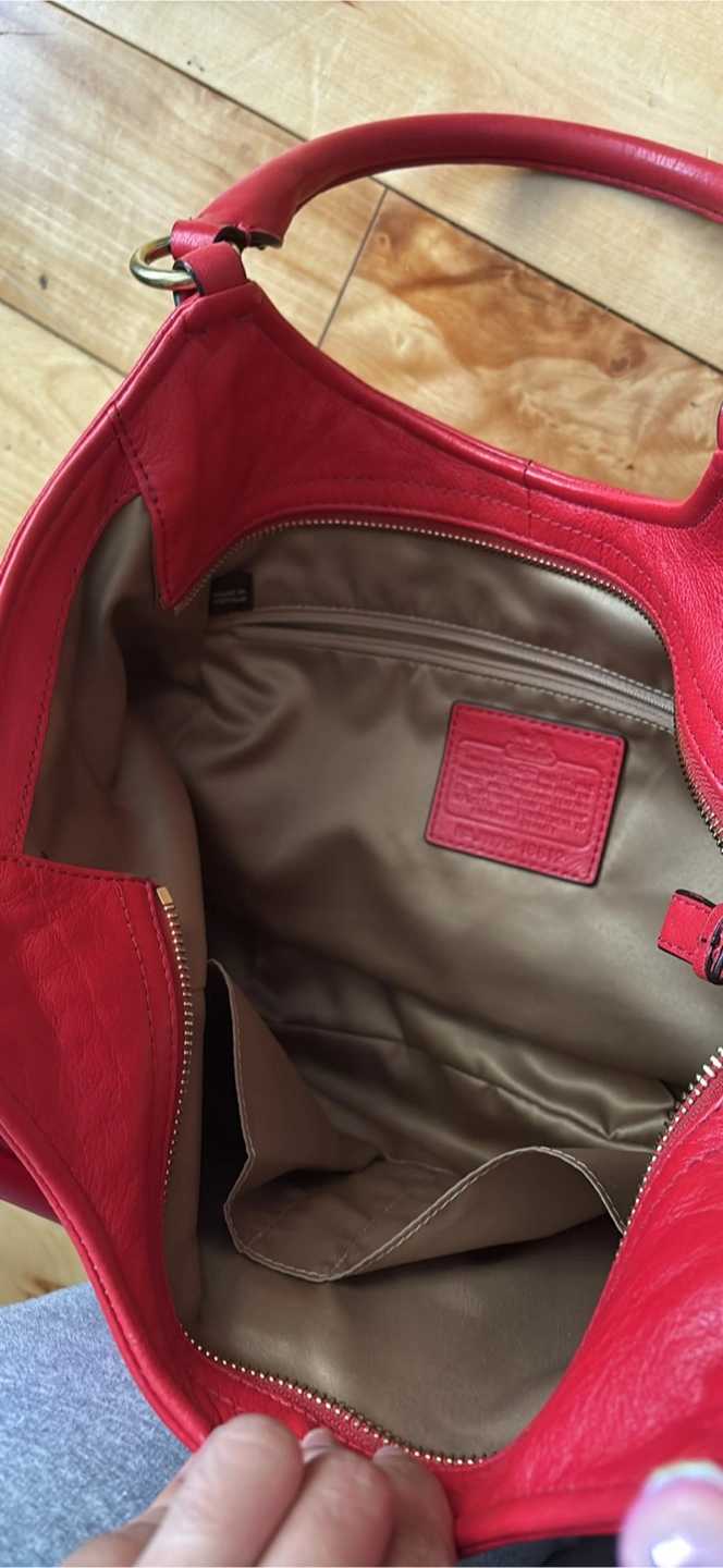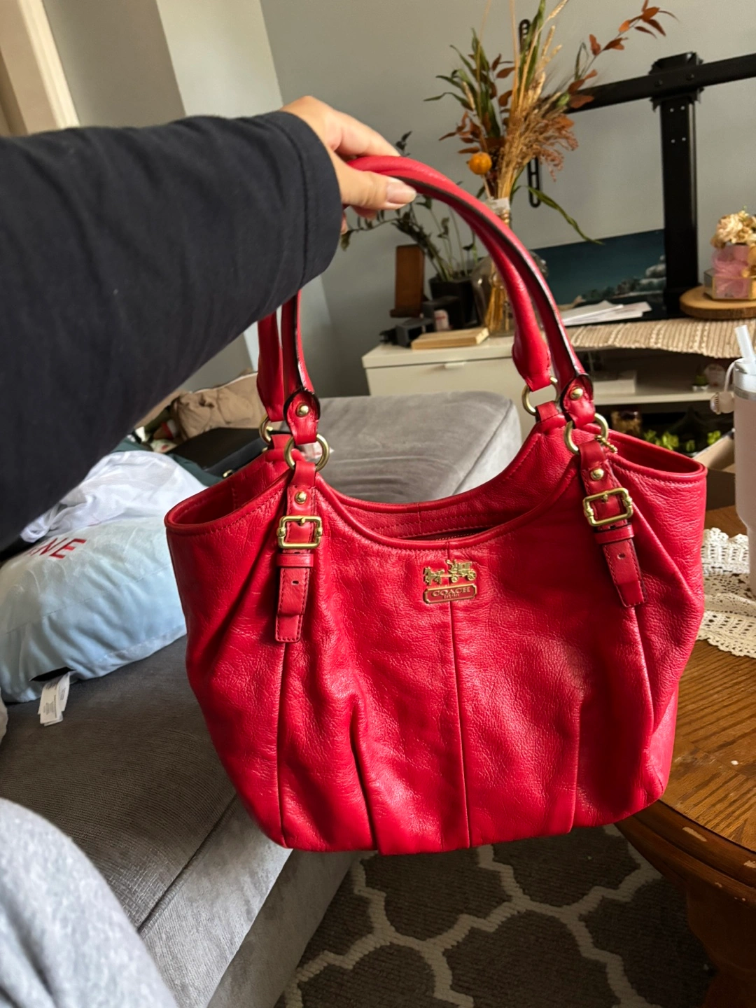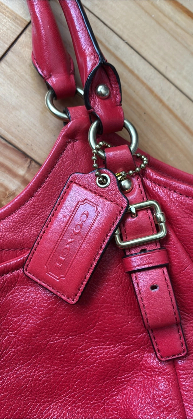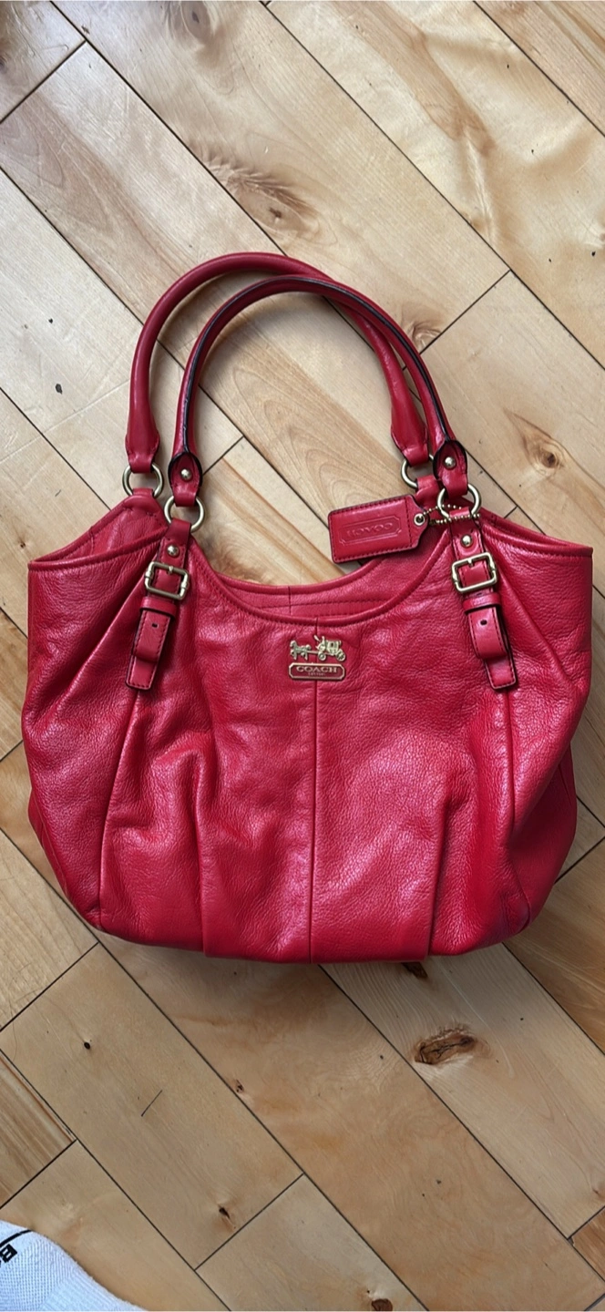 Beautiful red leather handbag. Gold hardware. Two top handles. Interior pockets. Coach logo present. Gently used.