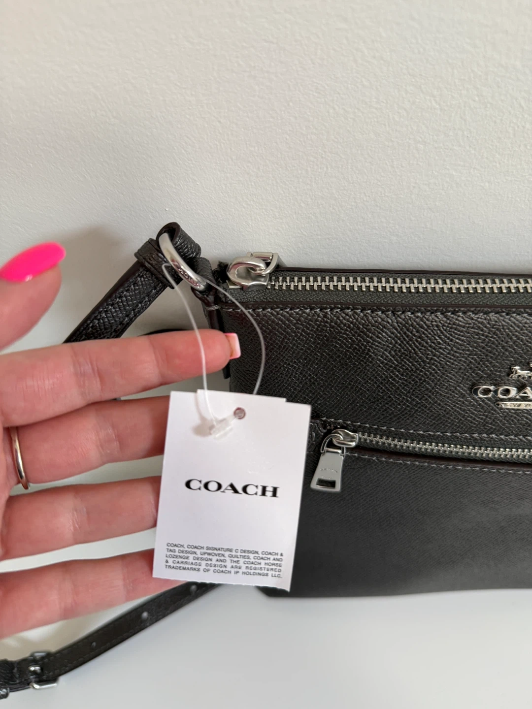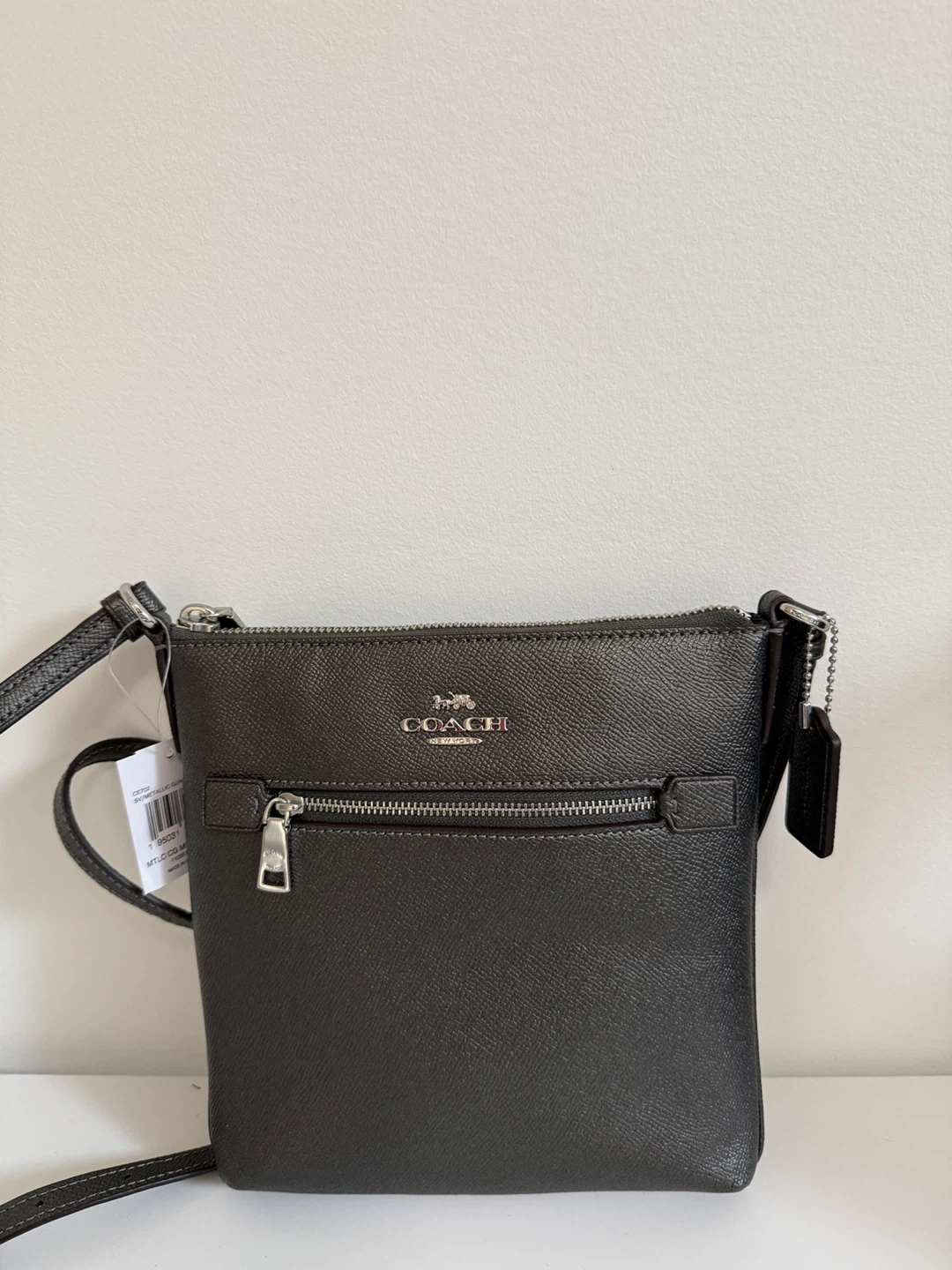This is a brand new Coach Mini Rowan Crossbody bag in a beautiful metallic gunmetal colour. It's perfect for carrying your essentials in style! The bag is made of high-quality materials and features the Coach logo. Never been used!