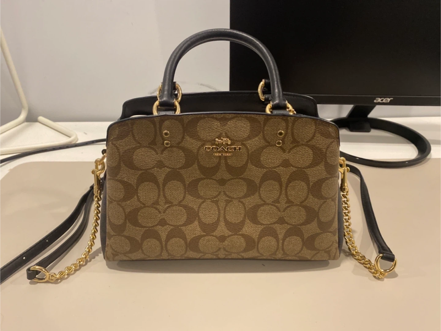 This stylish bag is in great condition and perfect for everyday use. It features a classic design with gold-tone hardware and a detachable strap for versatile carrying options. The interior is spacious enough to hold your essentials, making it both practical and fashionable