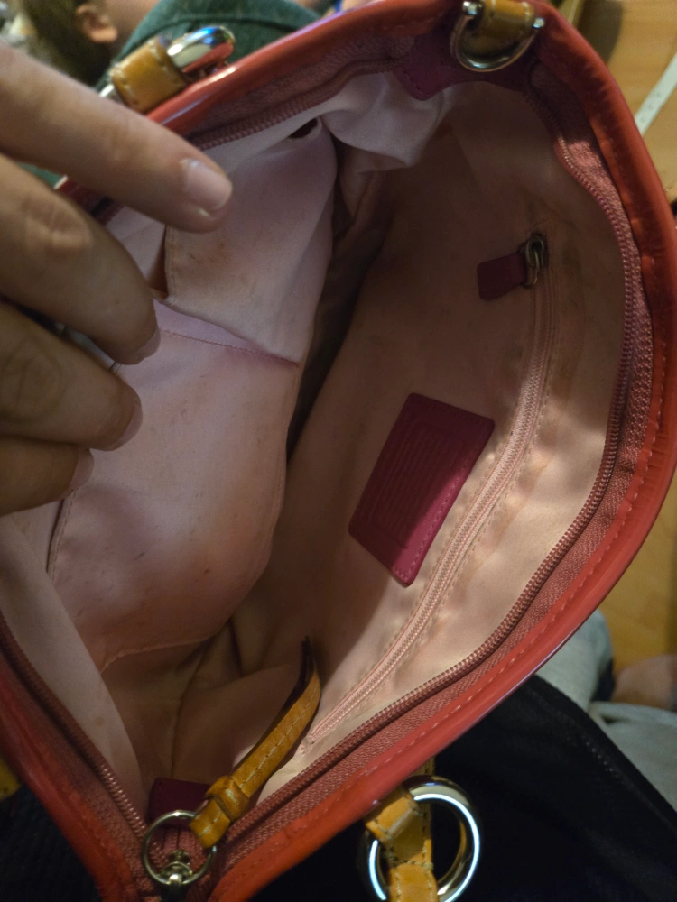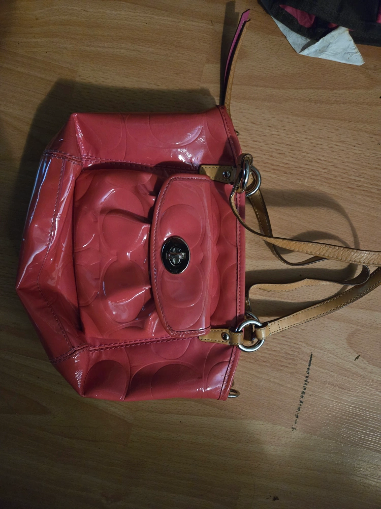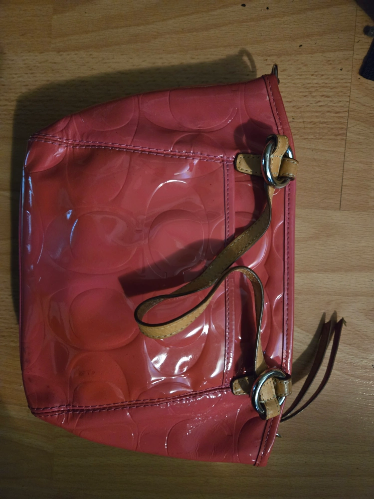 Selling a Coach handbag in pink patent leather. It has some signs of wear on the inside, but the exterior is in good condition. The bag features the classic Coach design. Perfect for everyday use!