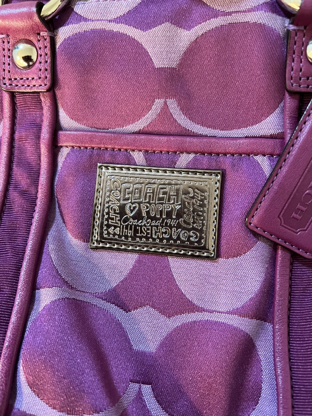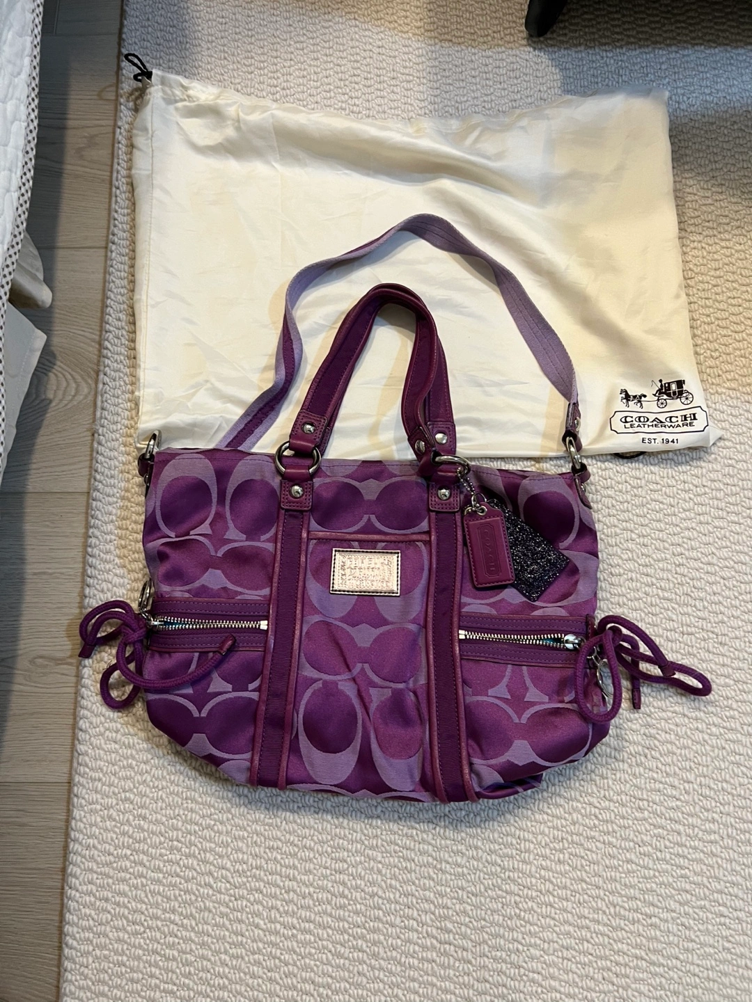 Purple Coach Poppy tote bag. Features signature Coach pattern. Includes dust bag. Multiple pockets and zippers. Excellent condition.