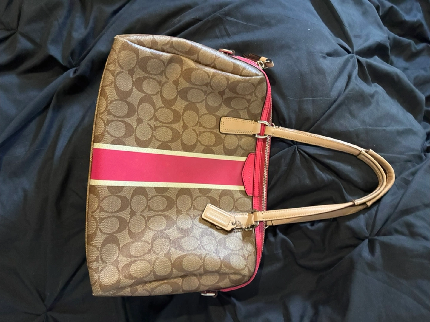 Selling a cute Coach satchel handbag! It features the classic Coach logo pattern in brown with a stylish pink stripe. The bag has tan-coloured handles and trim. It's in great condition and ready for a new home!