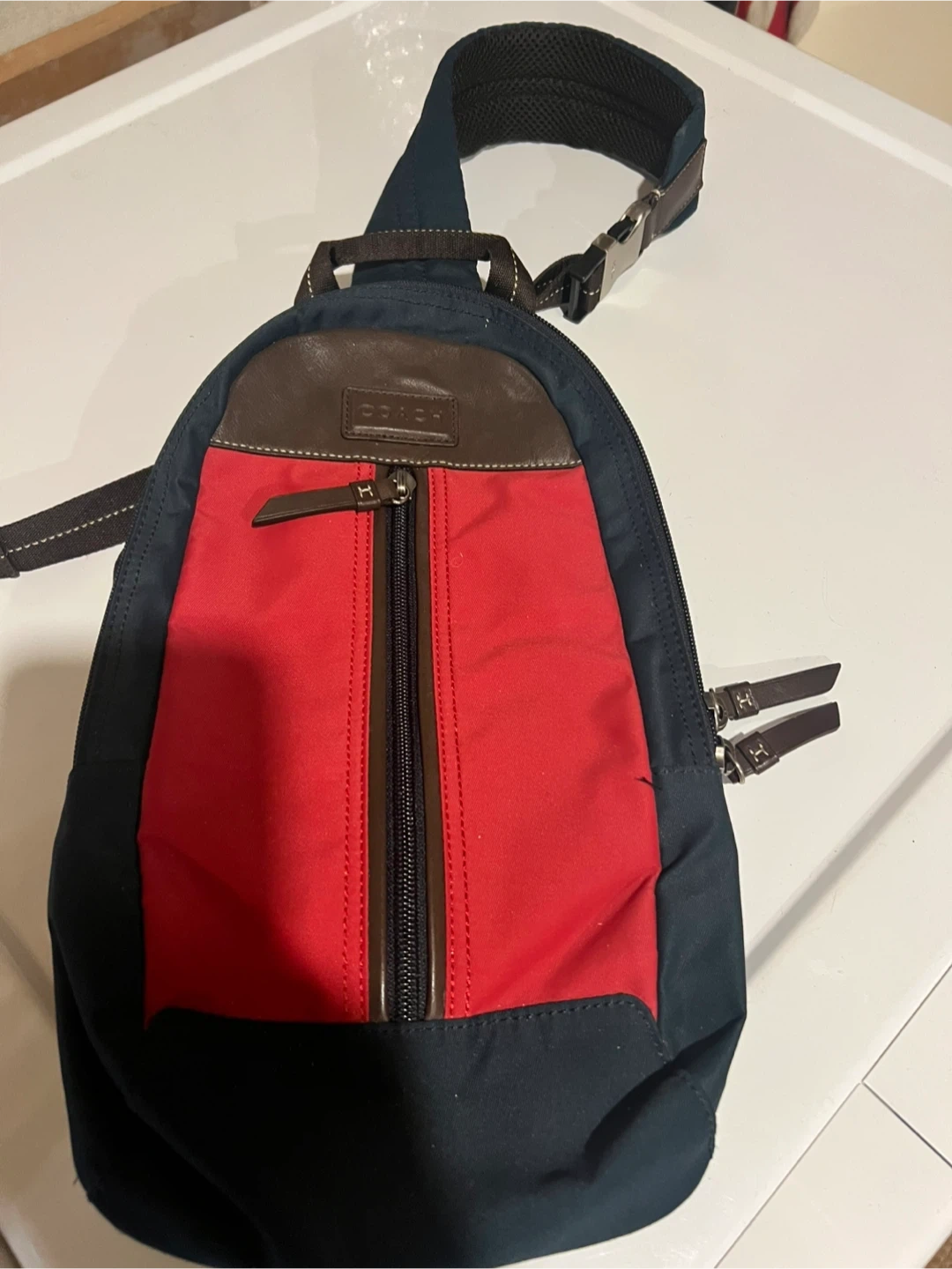 Selling a Coach sling backpack! It's in great condition and perfect for carrying your essentials around town. It features a stylish design with a red and navy colour scheme and brown leather accents. The bag has a comfortable adjustable strap and a zippered front pocket for easy access to your belongings