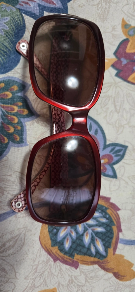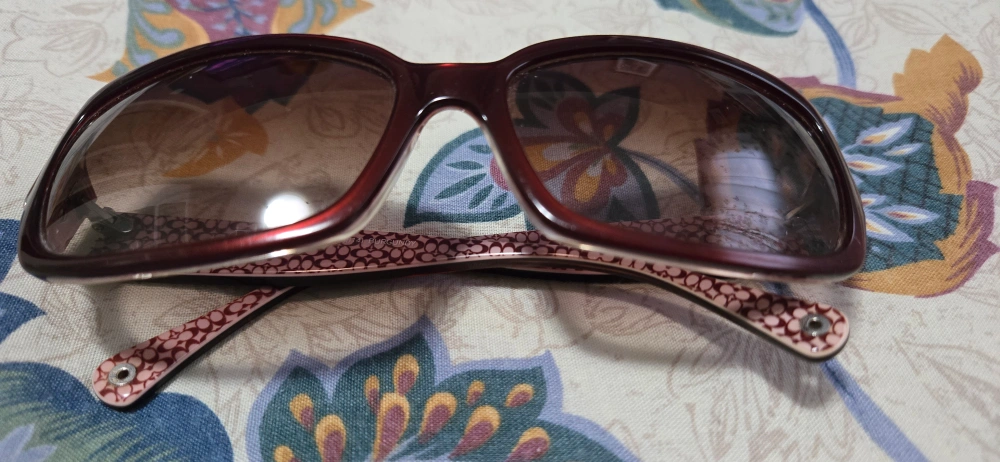 Selling a pair of Coach sunglasses! They have a reddish-pink frame with a subtle pattern on the arms. Great for adding a touch of style to any outfit