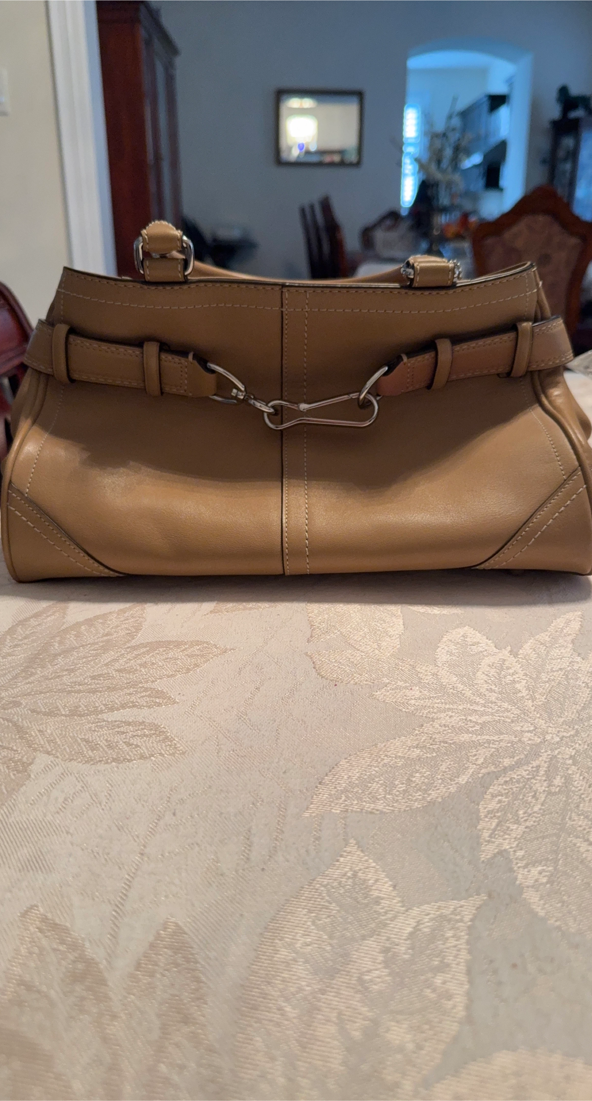 A stylish Coach handbag in a lovely tan colour. It's made of leather and features a unique design with buckle straps. Perfect for everyday use!