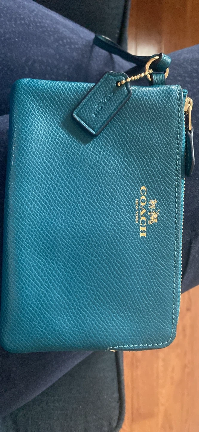 Selling a Coach wristlet wallet in a beautiful teal colour! It's in great condition and perfect for carrying your essentials. The wallet features a zip closure and several card slots inside. Also comes with Coach gift box would make a lovely gift