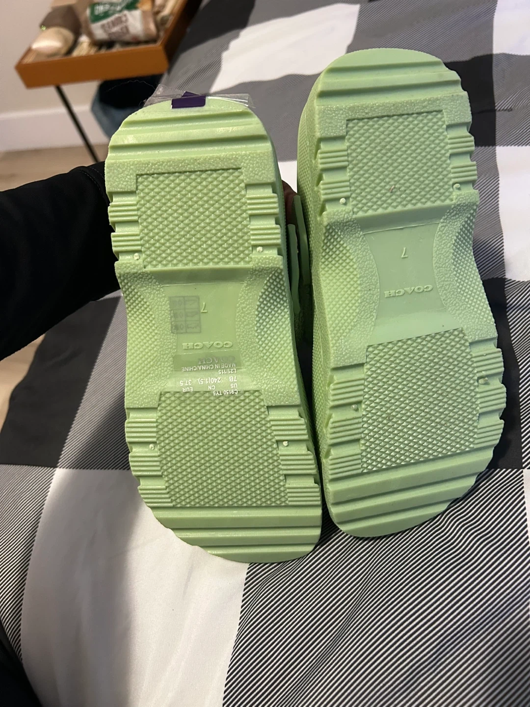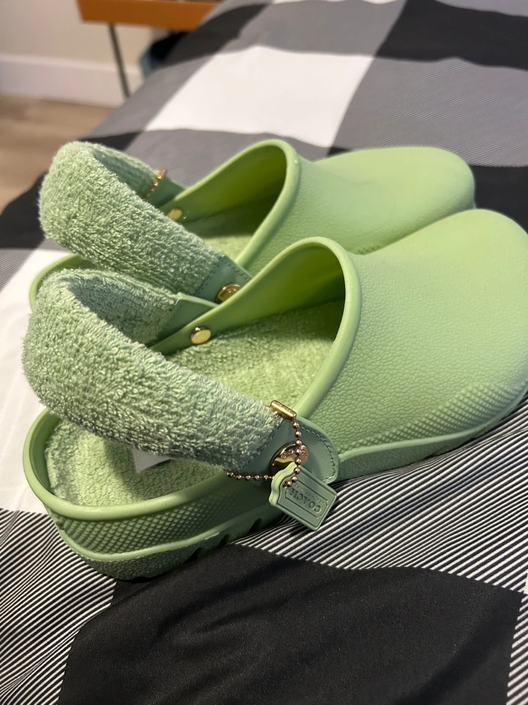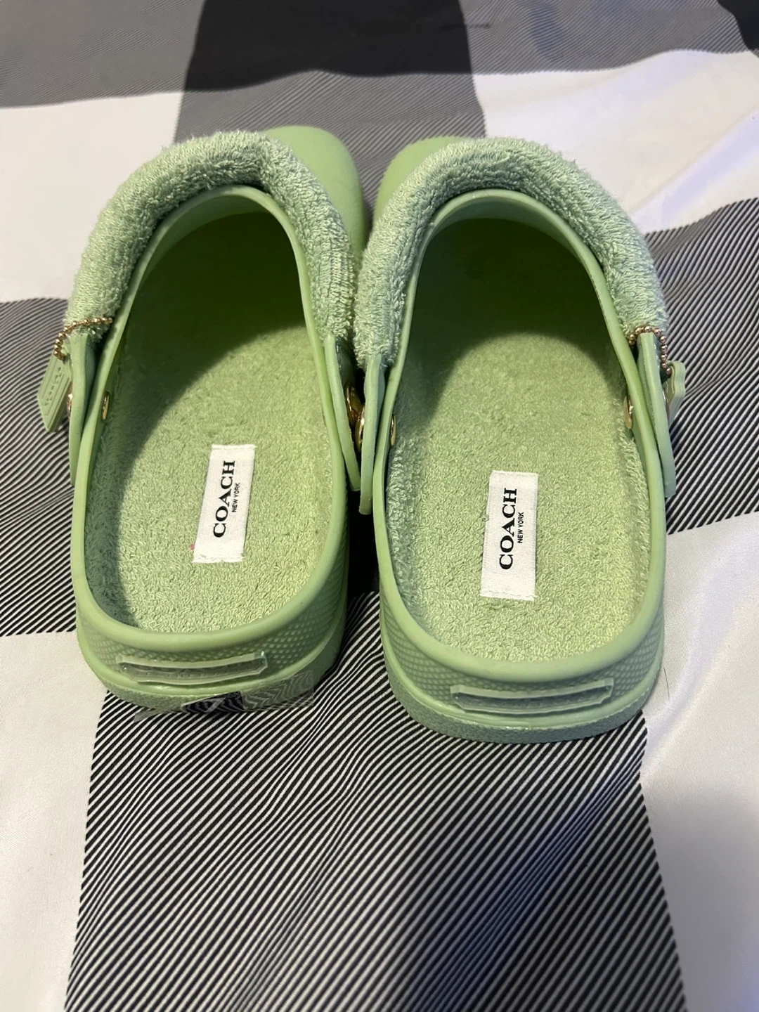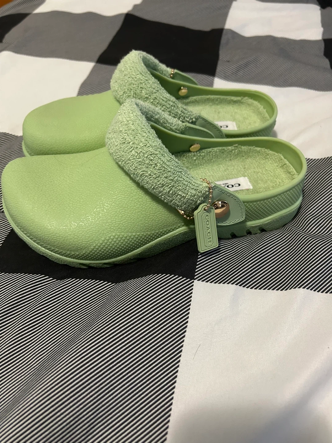 Selling a pair of Coach Terry Clogs in a light green colour! They are a size 7. These clogs feature a terry cloth band and a rubber sole. Perfect for a comfy and stylish look!