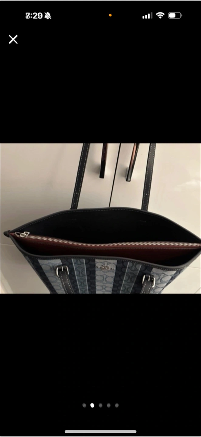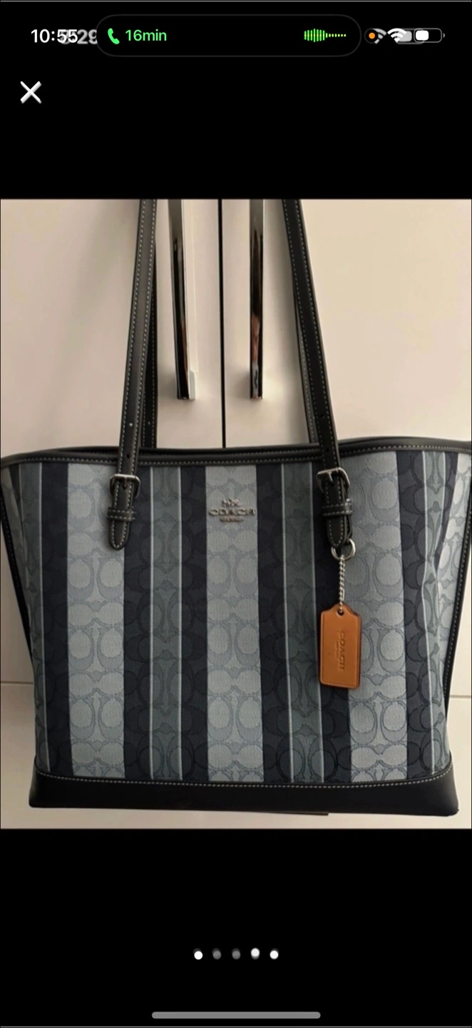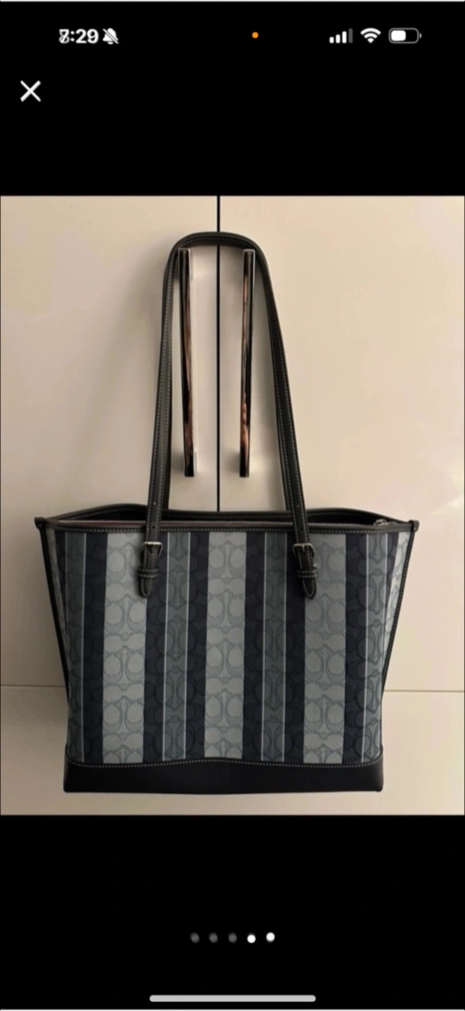 Here's a stylish Coach tote bag. It features a unique striped pattern in shades of blue and grey, with the Coach logo subtly incorporated into the design. The bag has black leather trim and handles, giving it a sophisticated look. It's in great condition and ready for a new home!