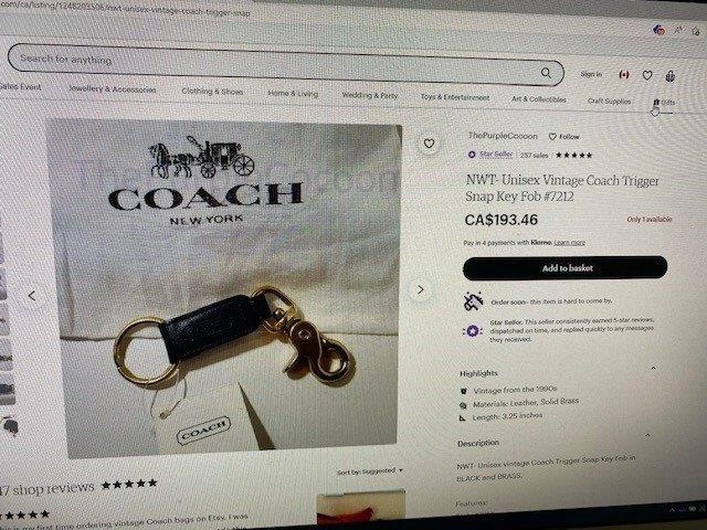 New with box and booklet as shown in the photos. This vintage Coach Trigger Snap Key Fob is made of dark chocolate leather and brass. On ETSY for $193.00. From a pet and smoke free home. Pickup only in the St. Lawrence market area of downtown Toronto. Cash only.