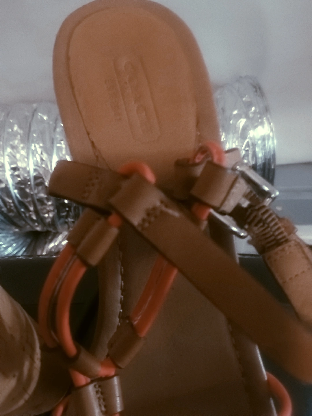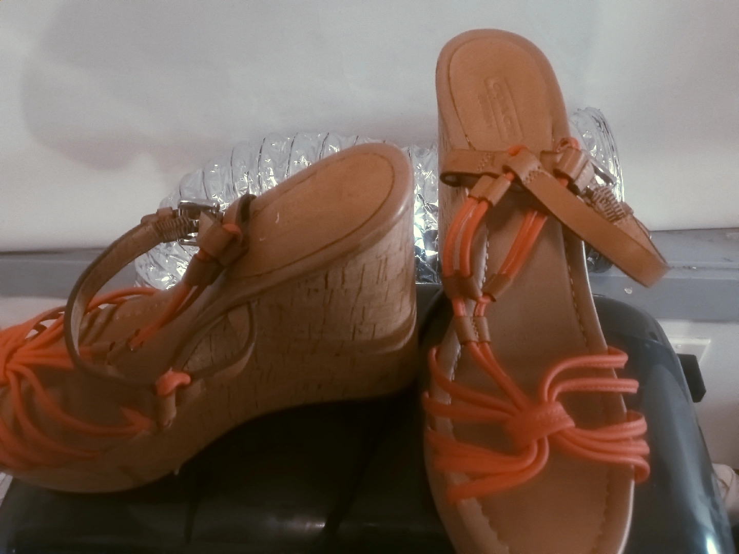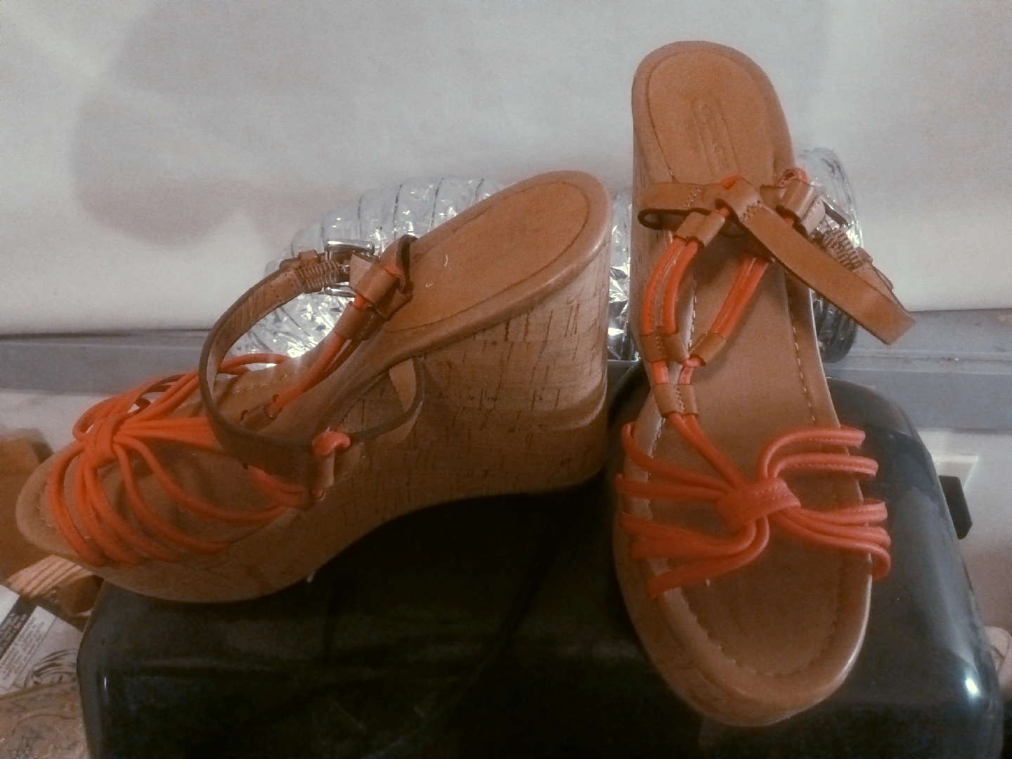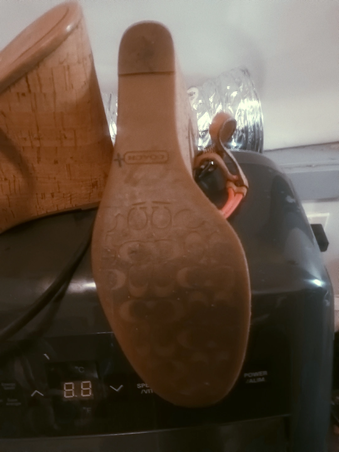 Cute pair of Coach wedge sandals! They are a size 8 and feature a cork wedge heel and orange straps. Perfect for summer!