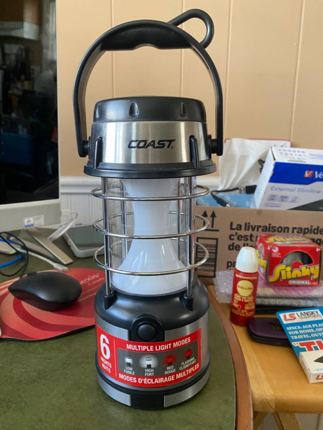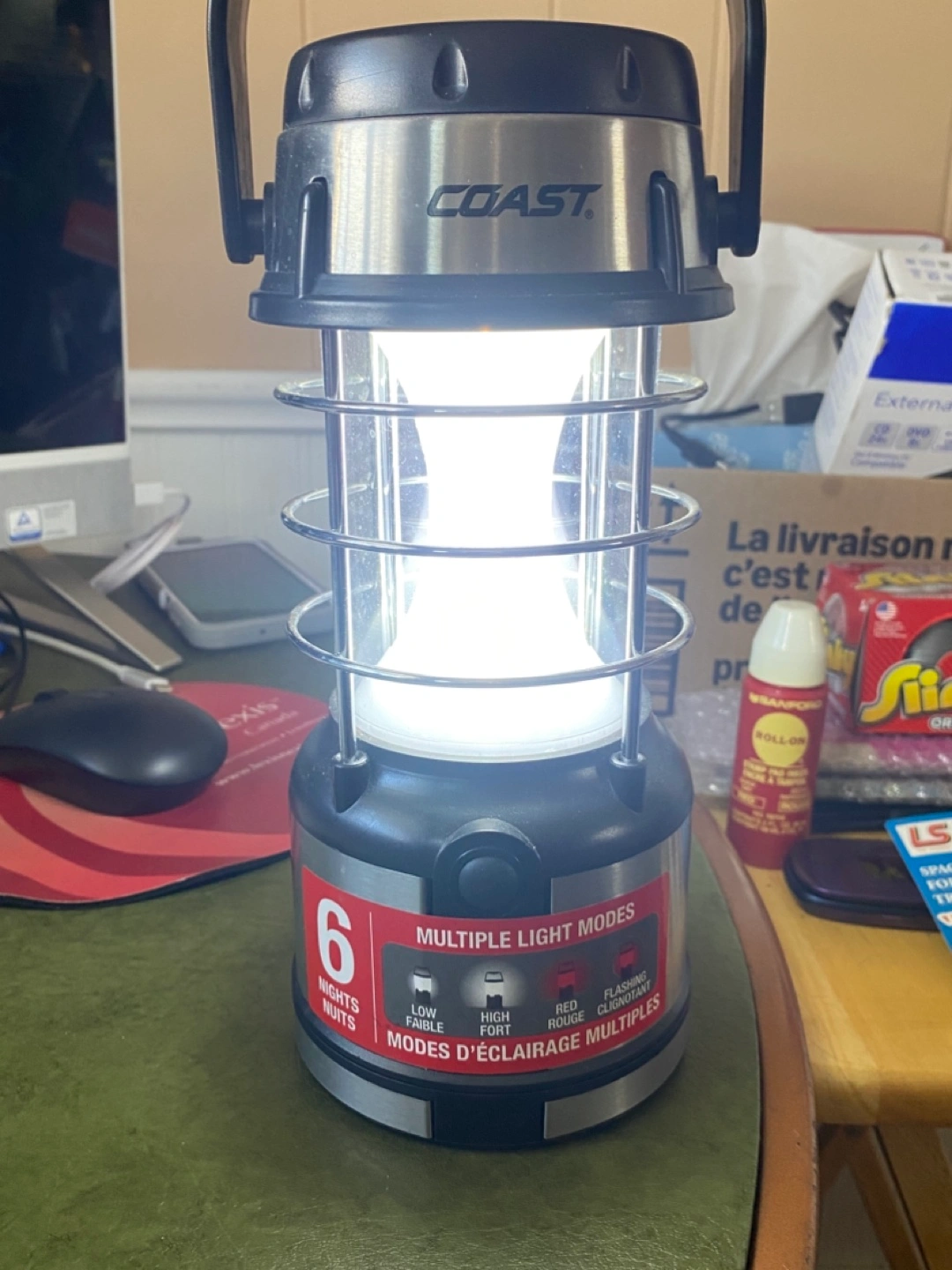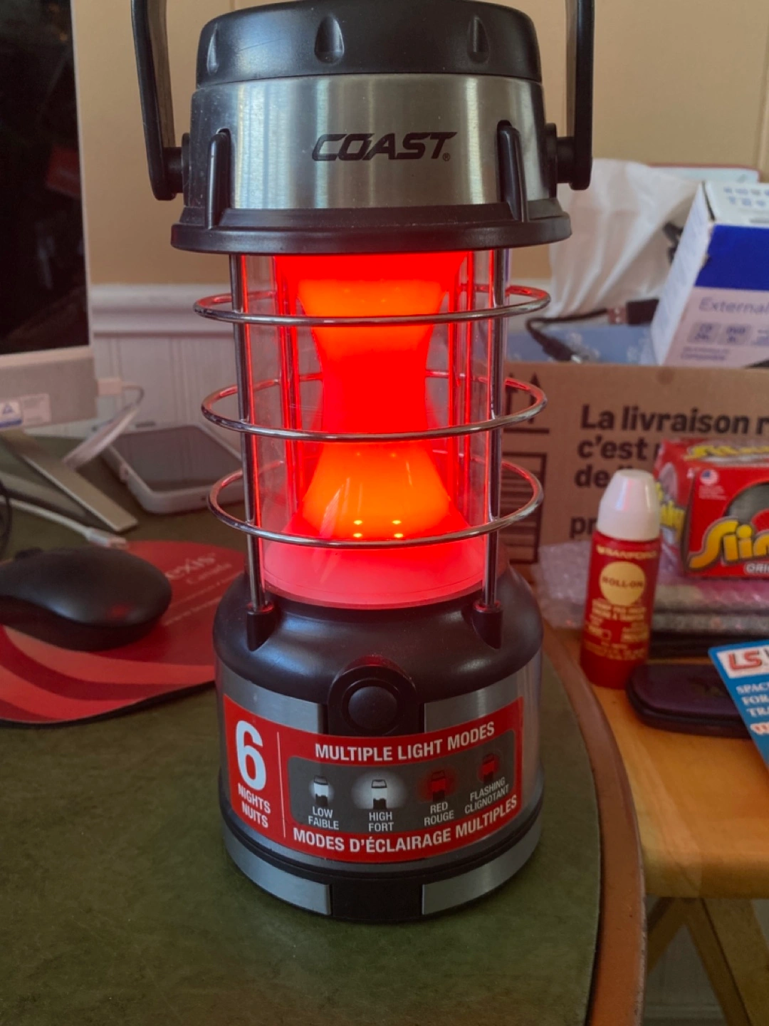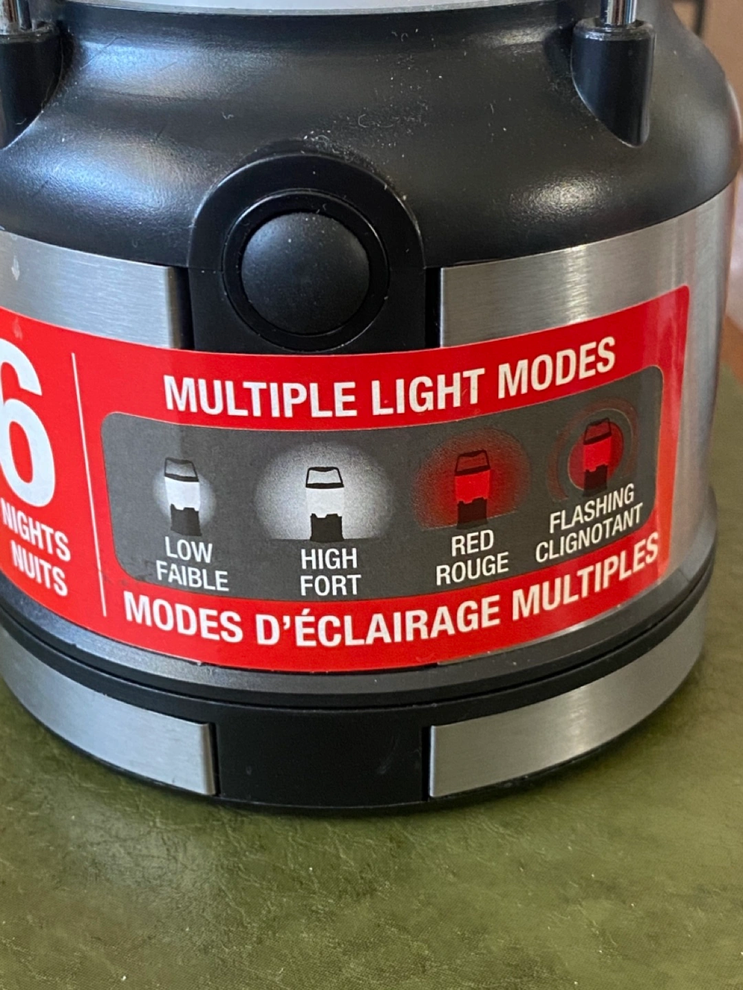 Portable lantern. Four light modes: low, high, red, and flashing. Stainless steel and black plastic construction. Carry handle. The red light is actually red, it’s just red light doesn’t photo well. :) We’re in Waasis but go into Freddy often.