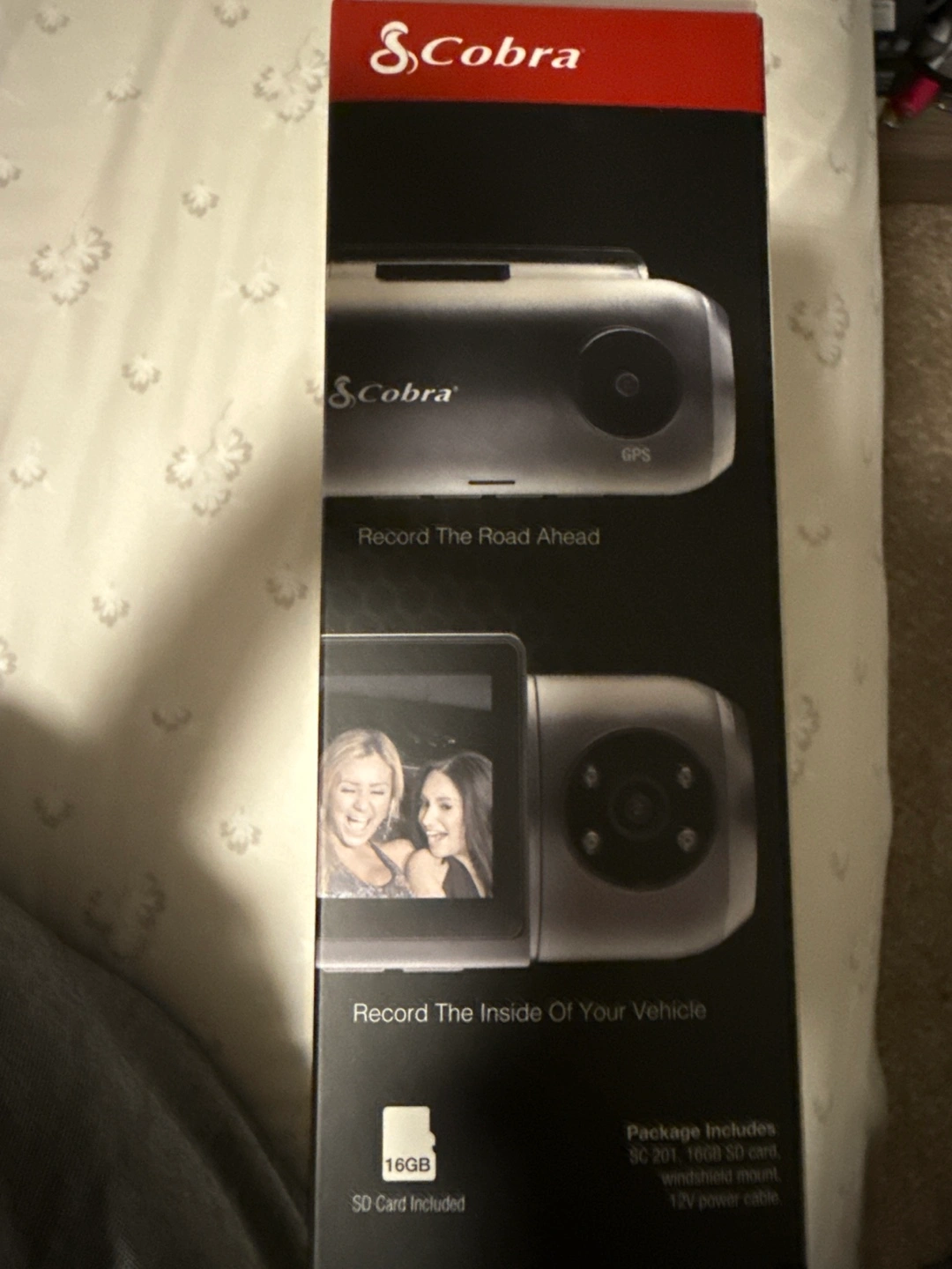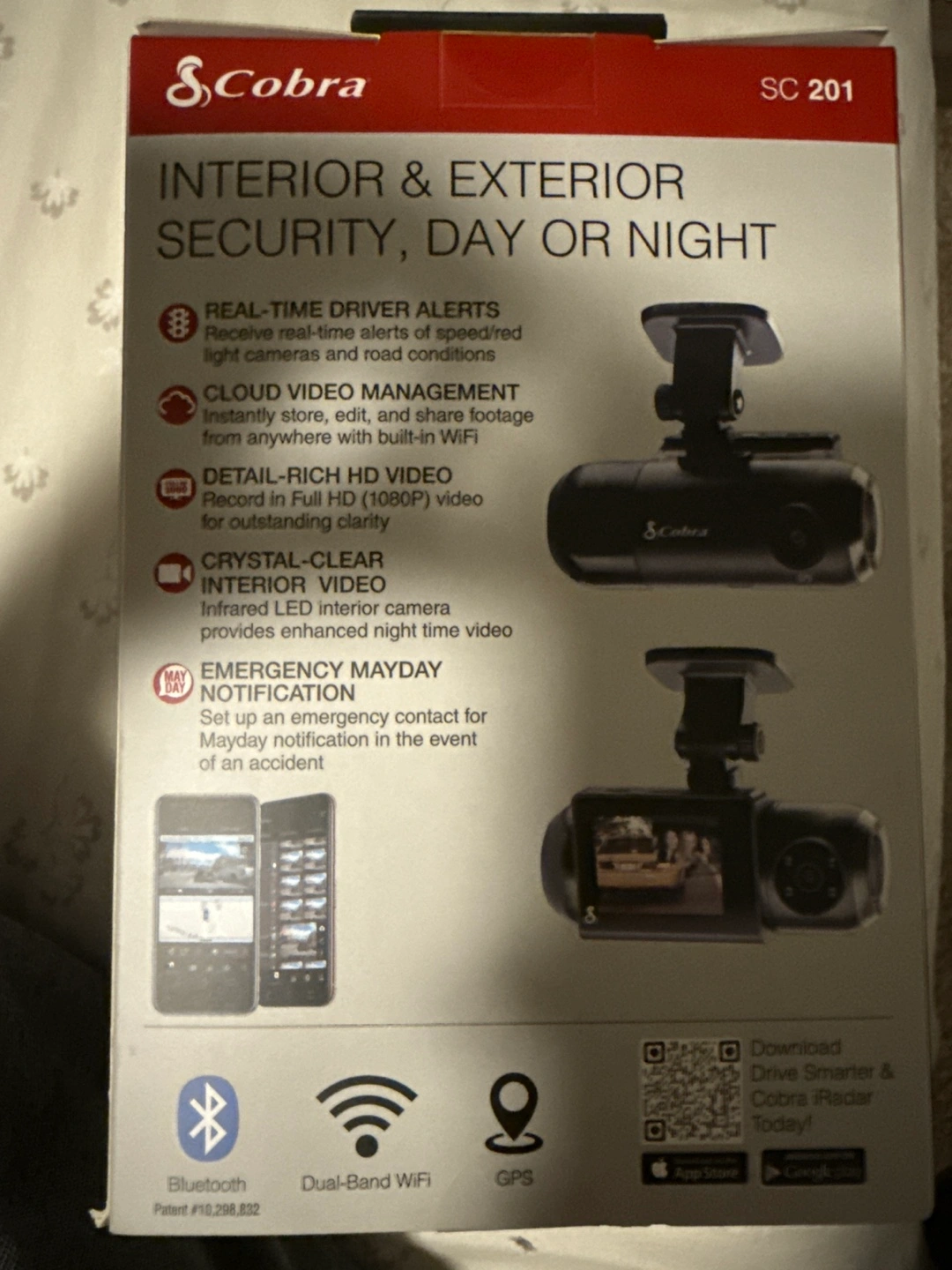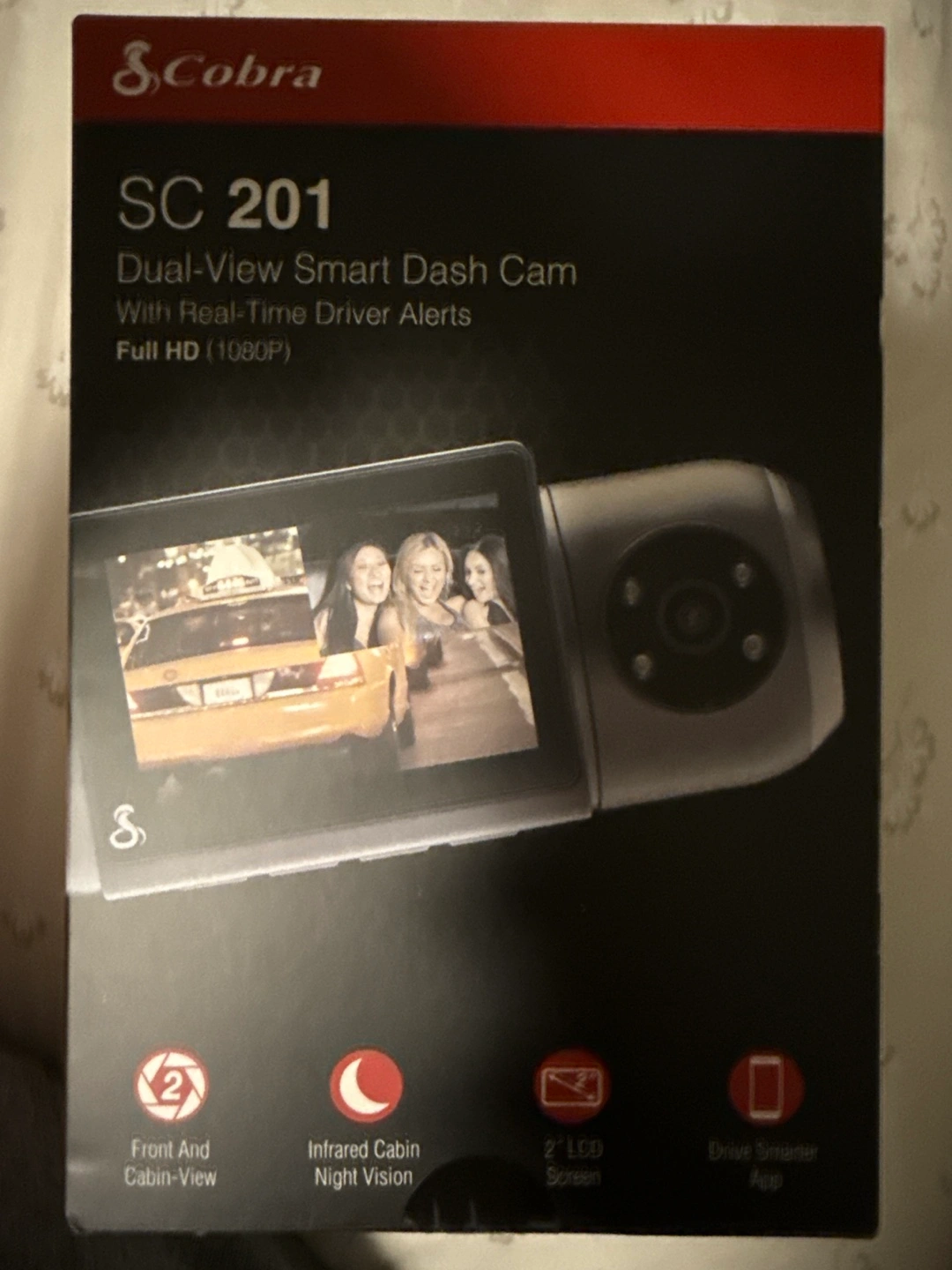 Selling a brand new Cobra SC 201 Dual-View Smart Dash Cam. It comes in the original box and includes: - SC 201 - 16GB SD card - Windshield mount - 12V power cable Key features include real-time driver alerts and cloud video management. It also records in Full HD (1080P) for outstanding clarity and has crystal-clear interior video with an infrared LED interior camera for enhanced night-time video