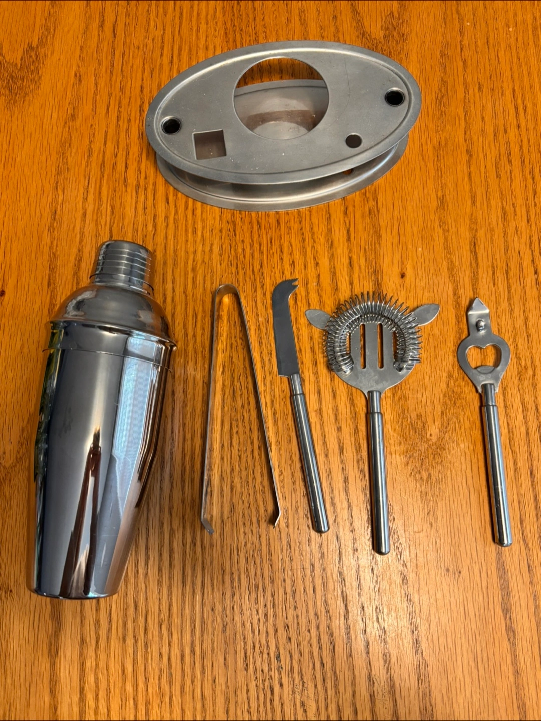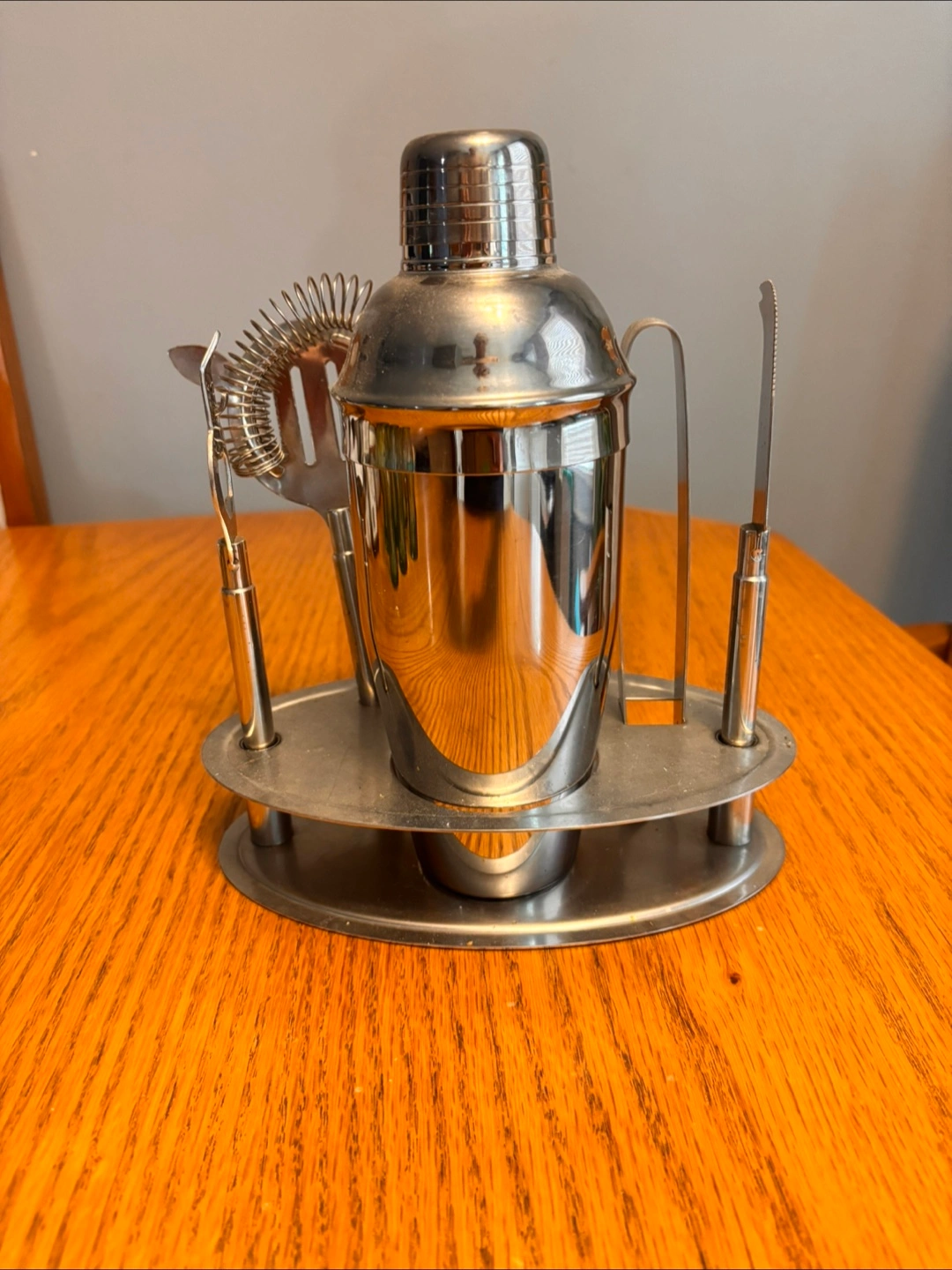 This cocktail shaker set includes a shaker, strainer, tongs, and other bar tools, all neatly arranged on a stand. Perfect for mixing up your favourite drinks at home!
