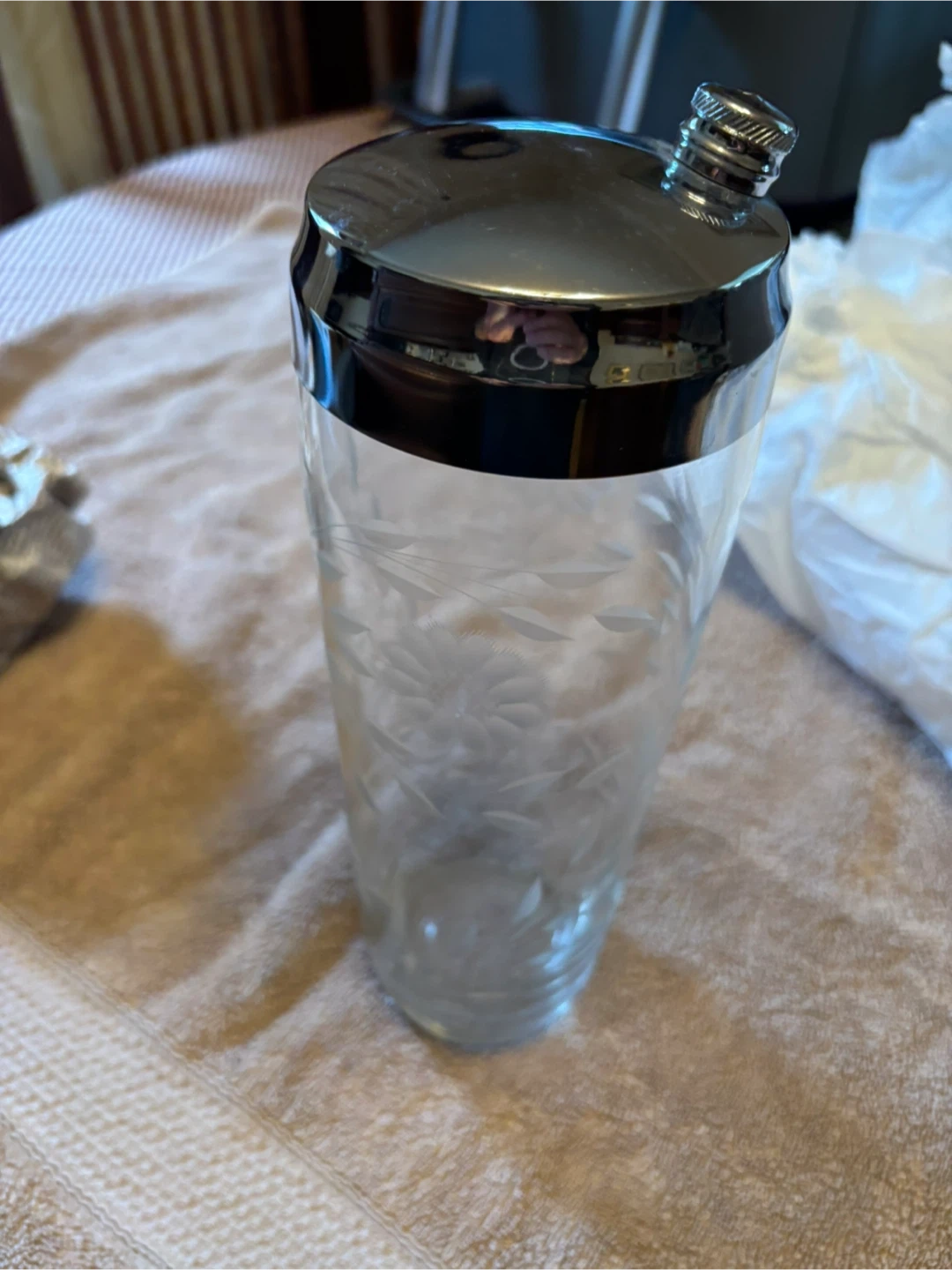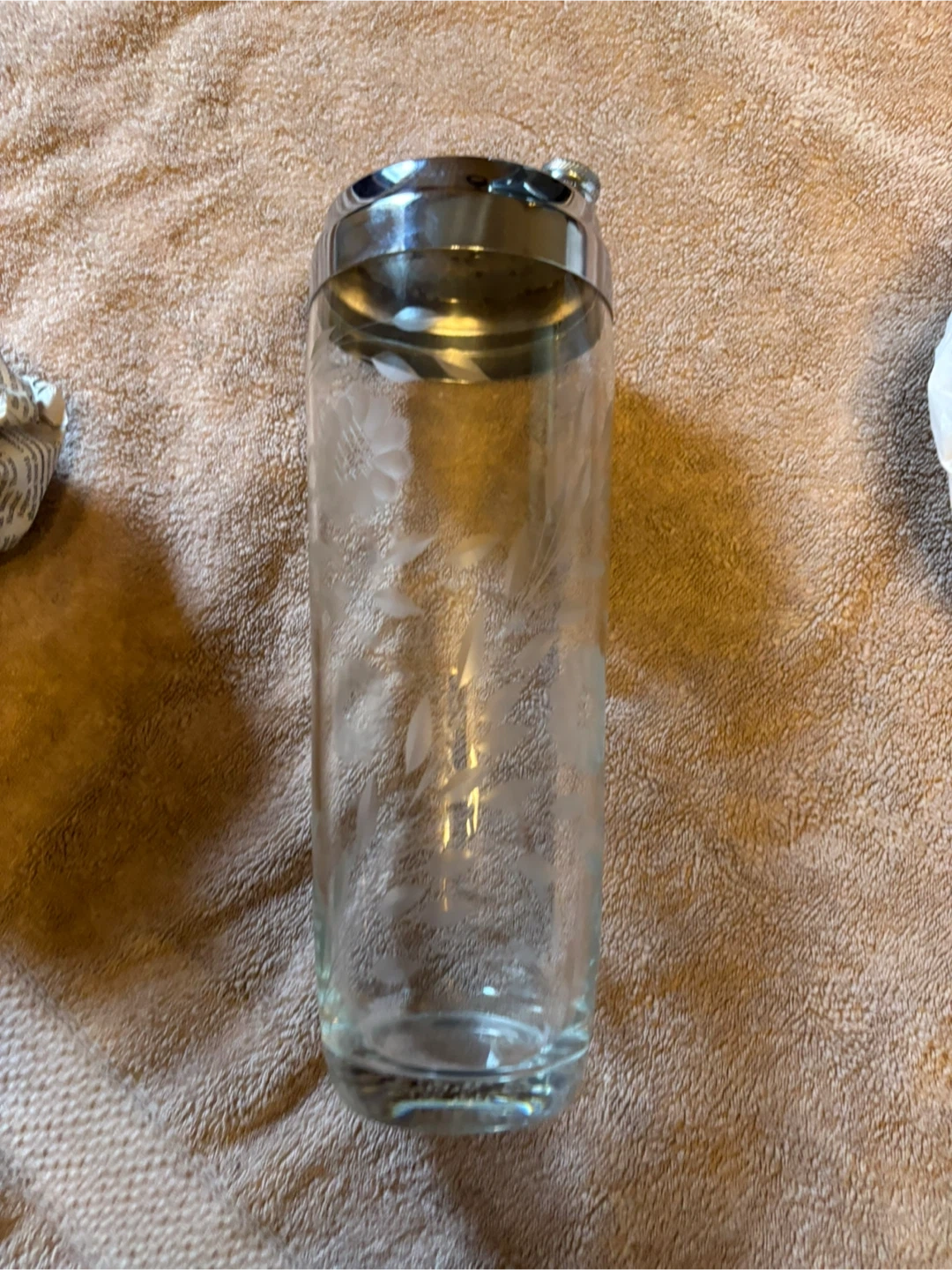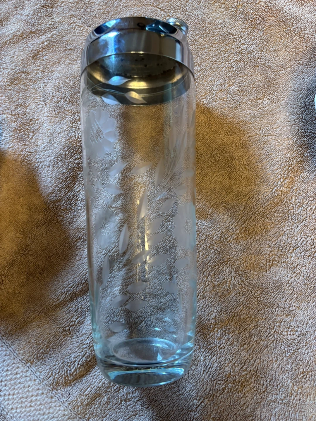 Cornflower design Selling a cocktail shaker with a lovely floral design etched into the glass. The top is a shiny chrome. Perfect for making your favourite drinks at home!
