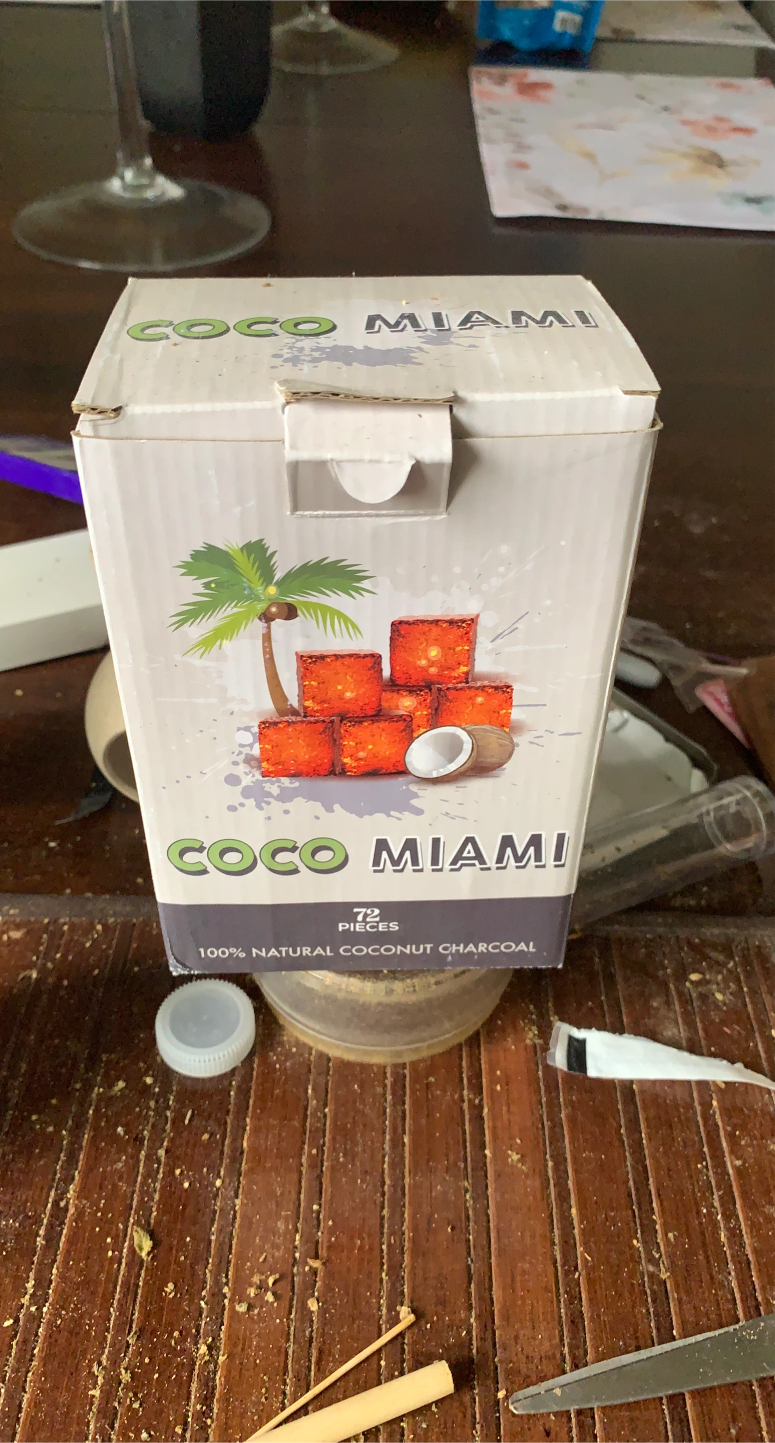 Selling a box of Coco Miami 100% Natural Coconut Charcoal. The box contains 72 pieces of charcoal.
