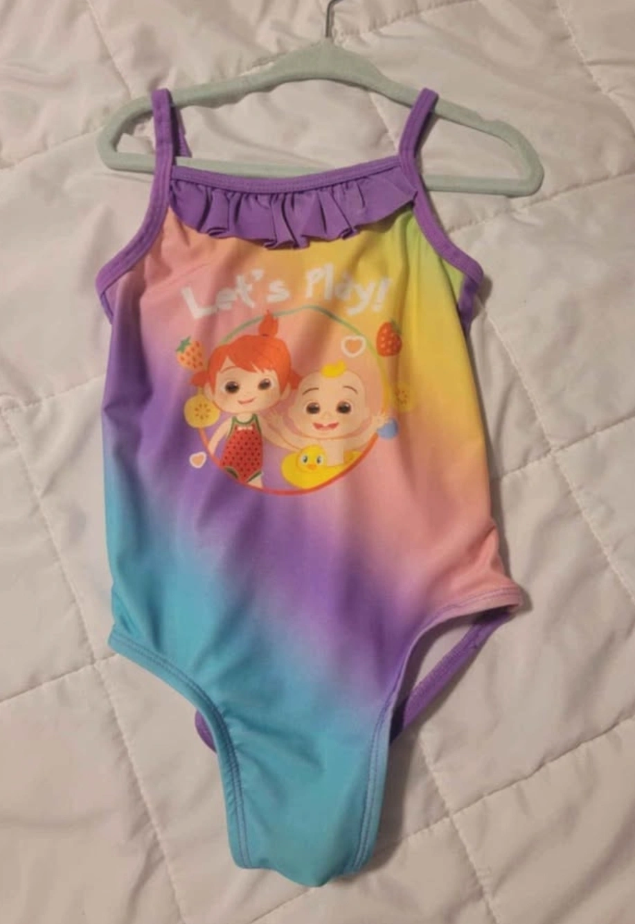 Cute Cocomelon swimsuit for kids! Features a colourful design with Cocomelon characters. Size 3T
