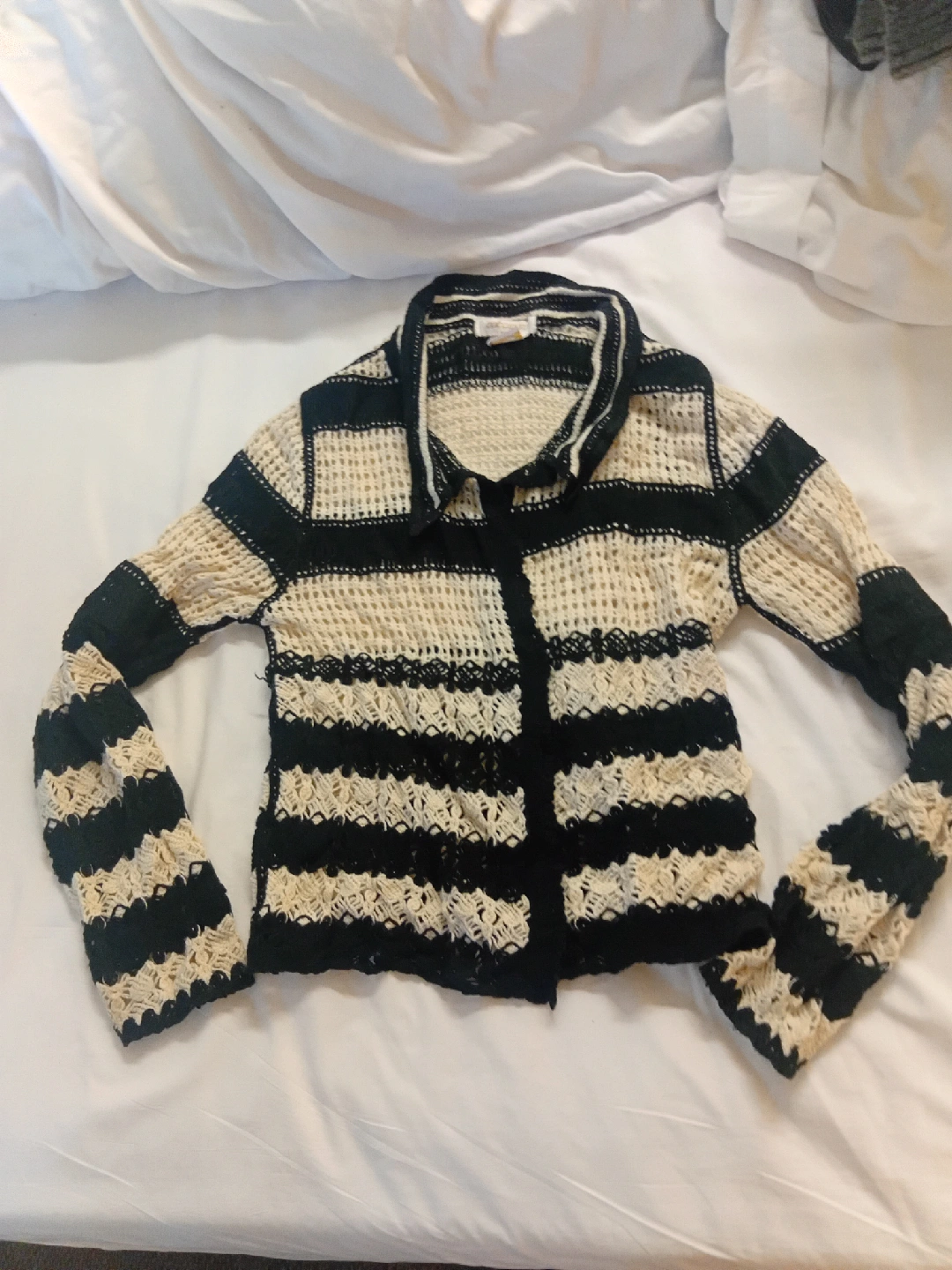 This Cocomio cardigan features a unique knit design with black and beige stripes. It's a stylish and comfortable piece that can be dressed up or down. Perfect for adding a touch of texture to any outfit!