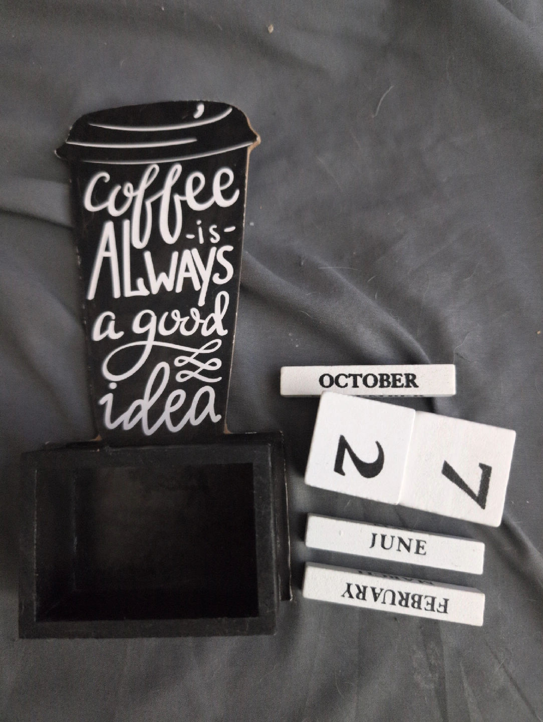 This is a cute perpetual calendar with a coffee theme! The blocks can be changed to display the date, and it says "Coffee is always a good idea" on the coffee cup. Perfect for a coffee lover's desk or kitchen!
