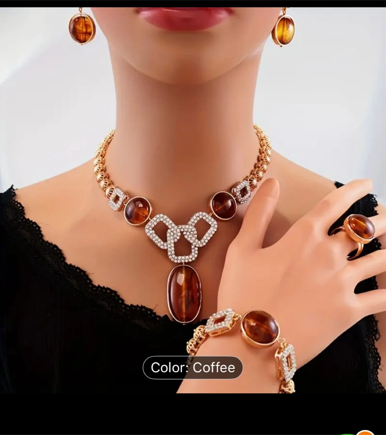 This is a beautiful jewellery set in a coffee colour. It includes a necklace, bracelet, earrings, and a ring. Perfect for adding a touch of elegance to any outfit
