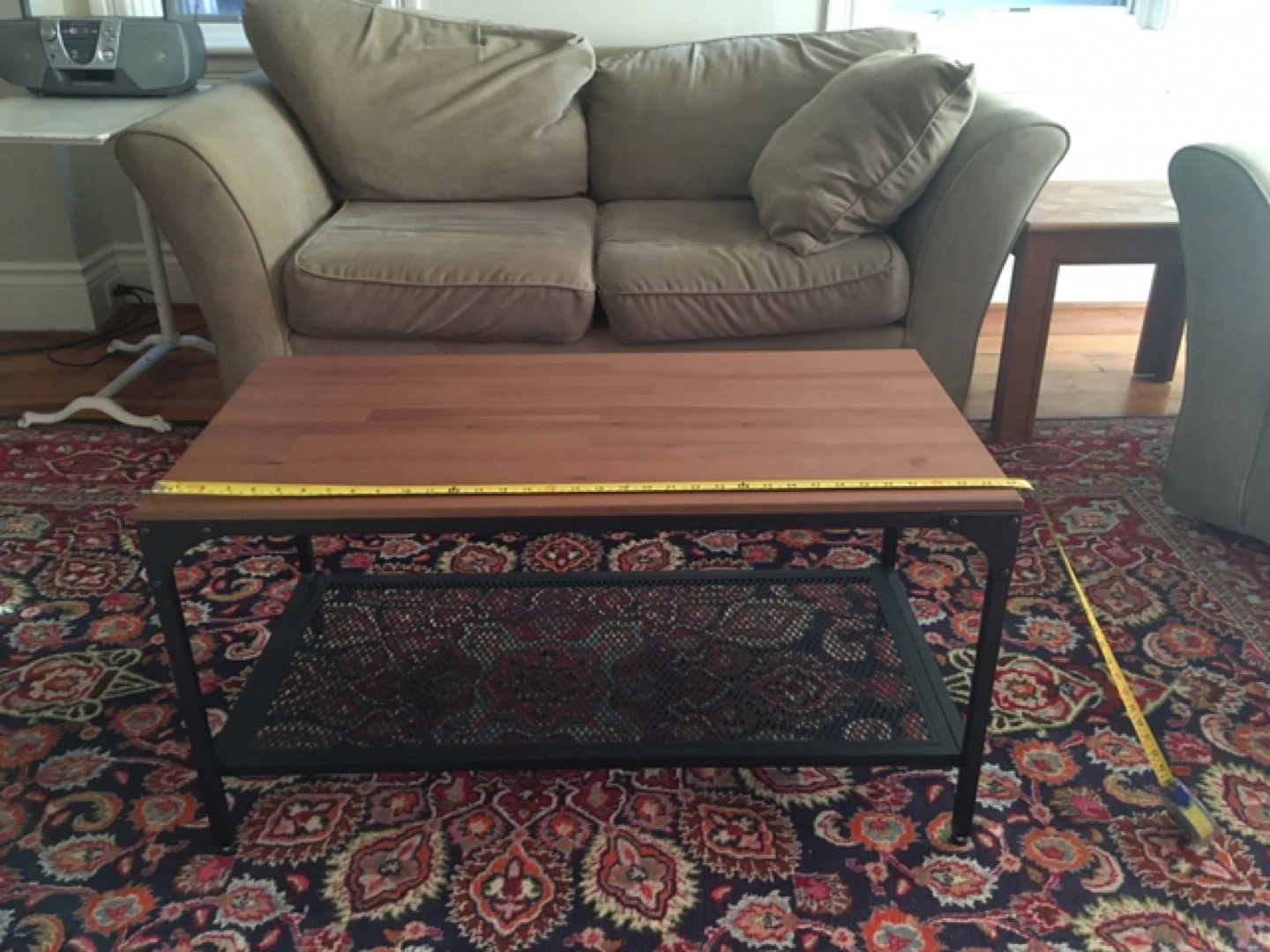 Modern coffee table. Features a wood top and black metal frame. Includes a lower shelf with a metal mesh design. Great for small spaces.