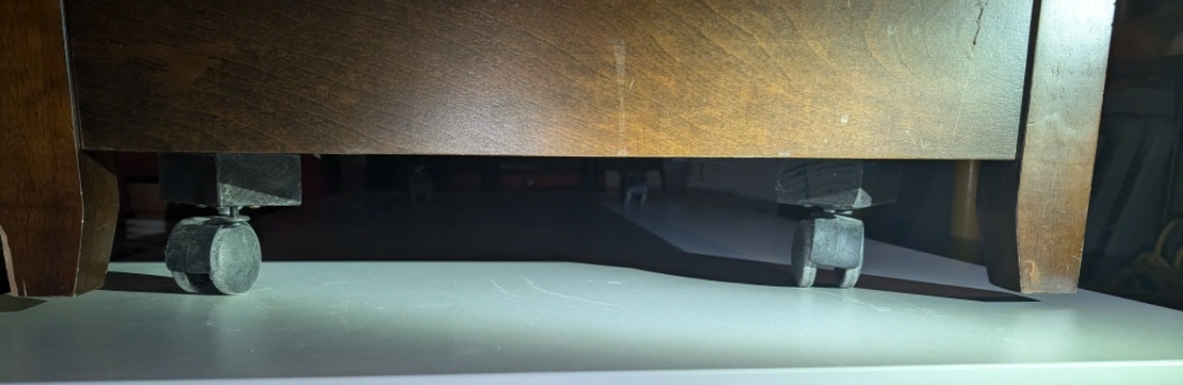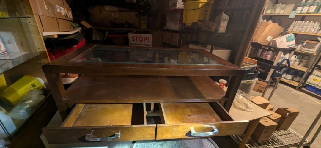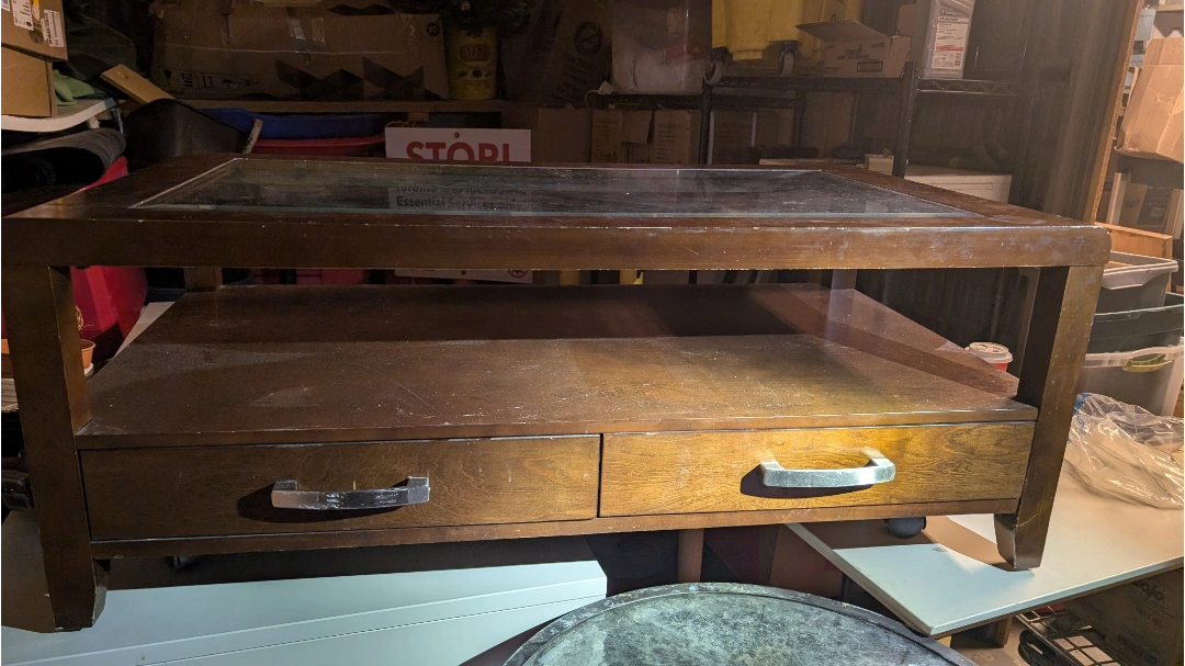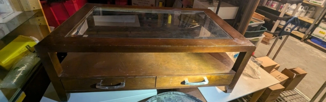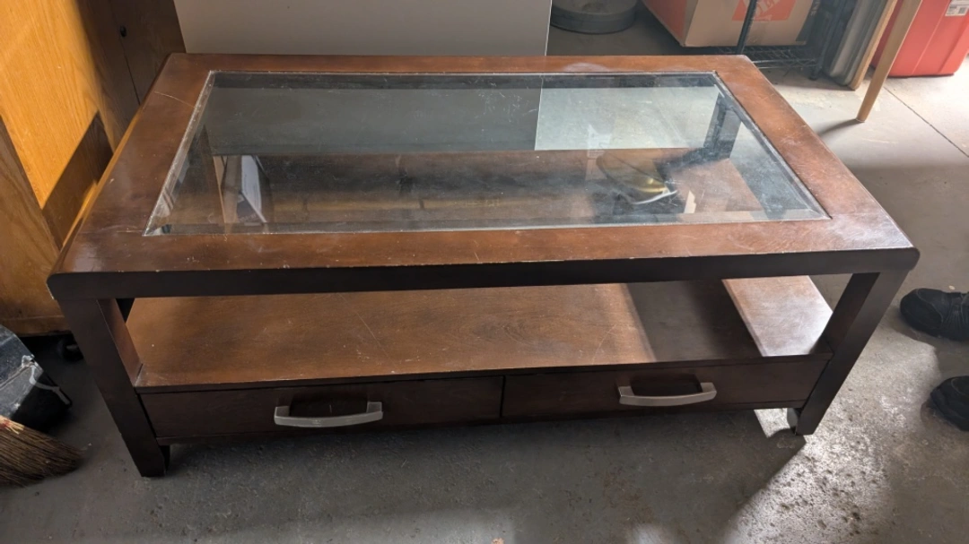 Dark brown wooden coffee table. Features a glass top, open lower shelf, and two drawers with silver handles. Table sits on four small casters. Dimensions: 3.88 × 2.16 × 1.5 ft (L × W × H)