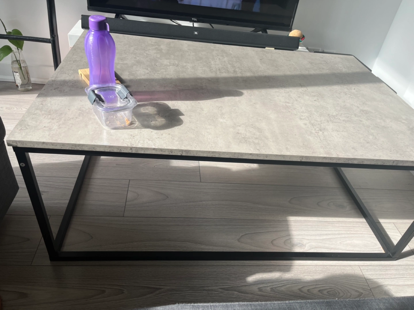 Black metal frame and mdf top. Good condition.