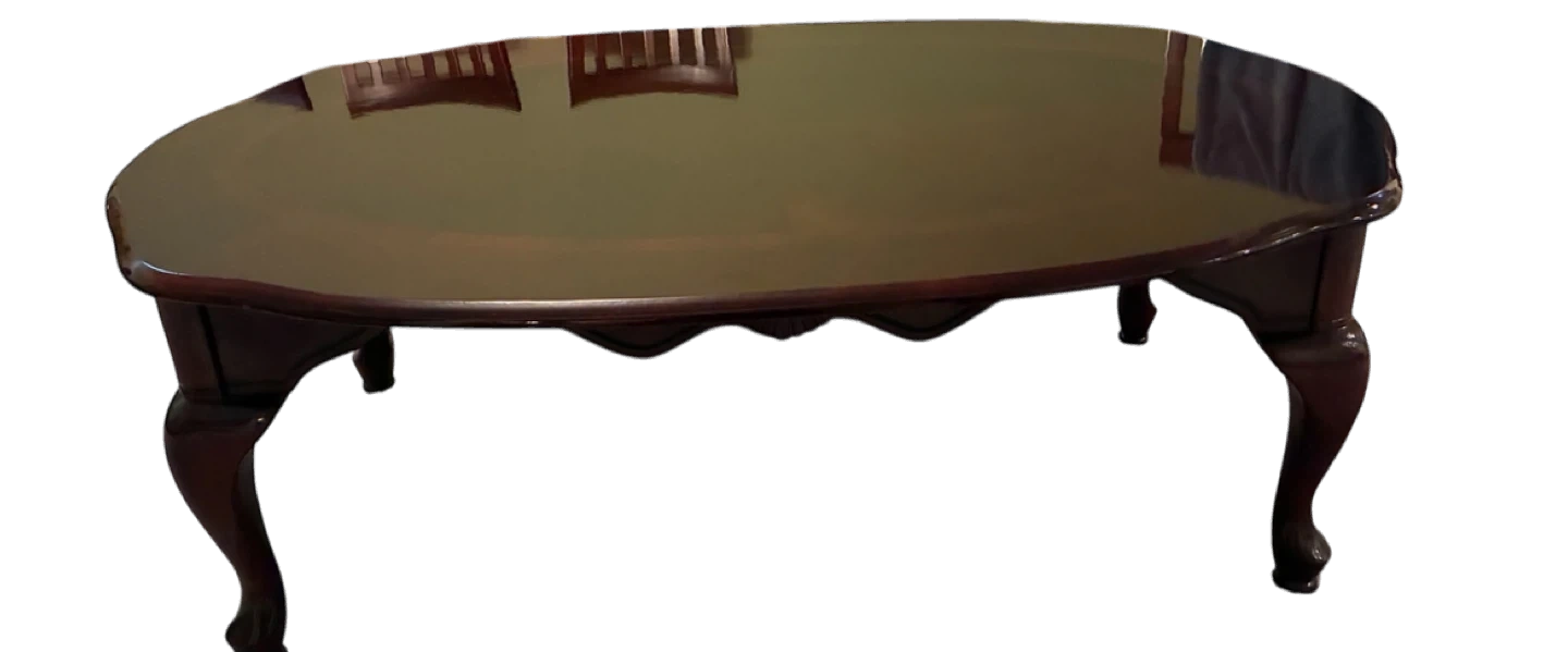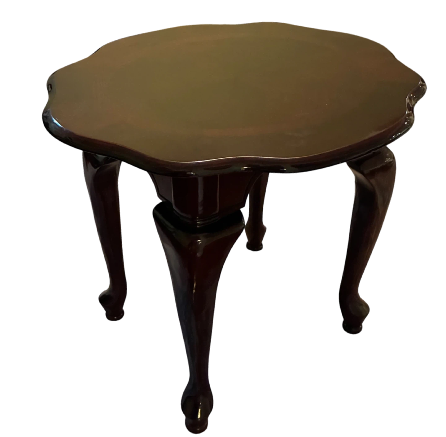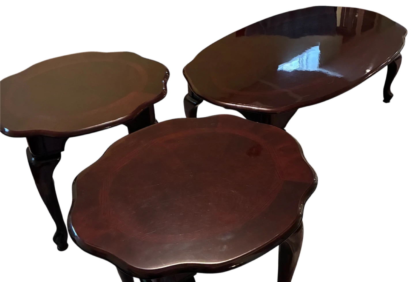Selling a set of three antique-style side tables and one coffee table These tables feature a dark wood finish and a classic design, perfect for adding a touch of elegance to any room. They are in good condition and ready to be used in your home!