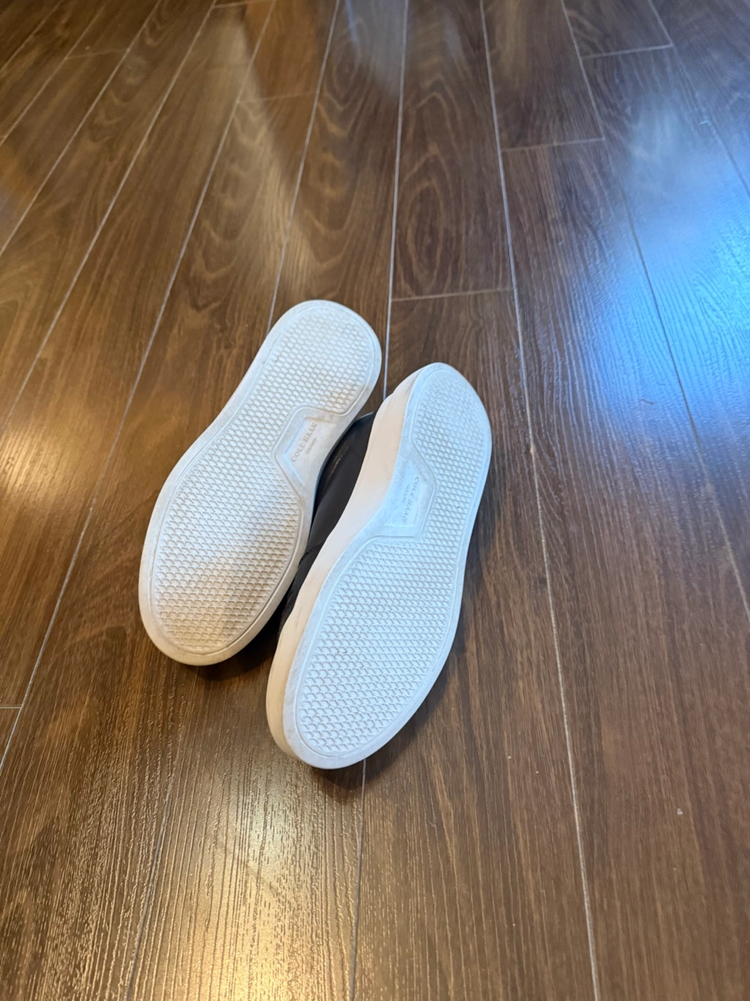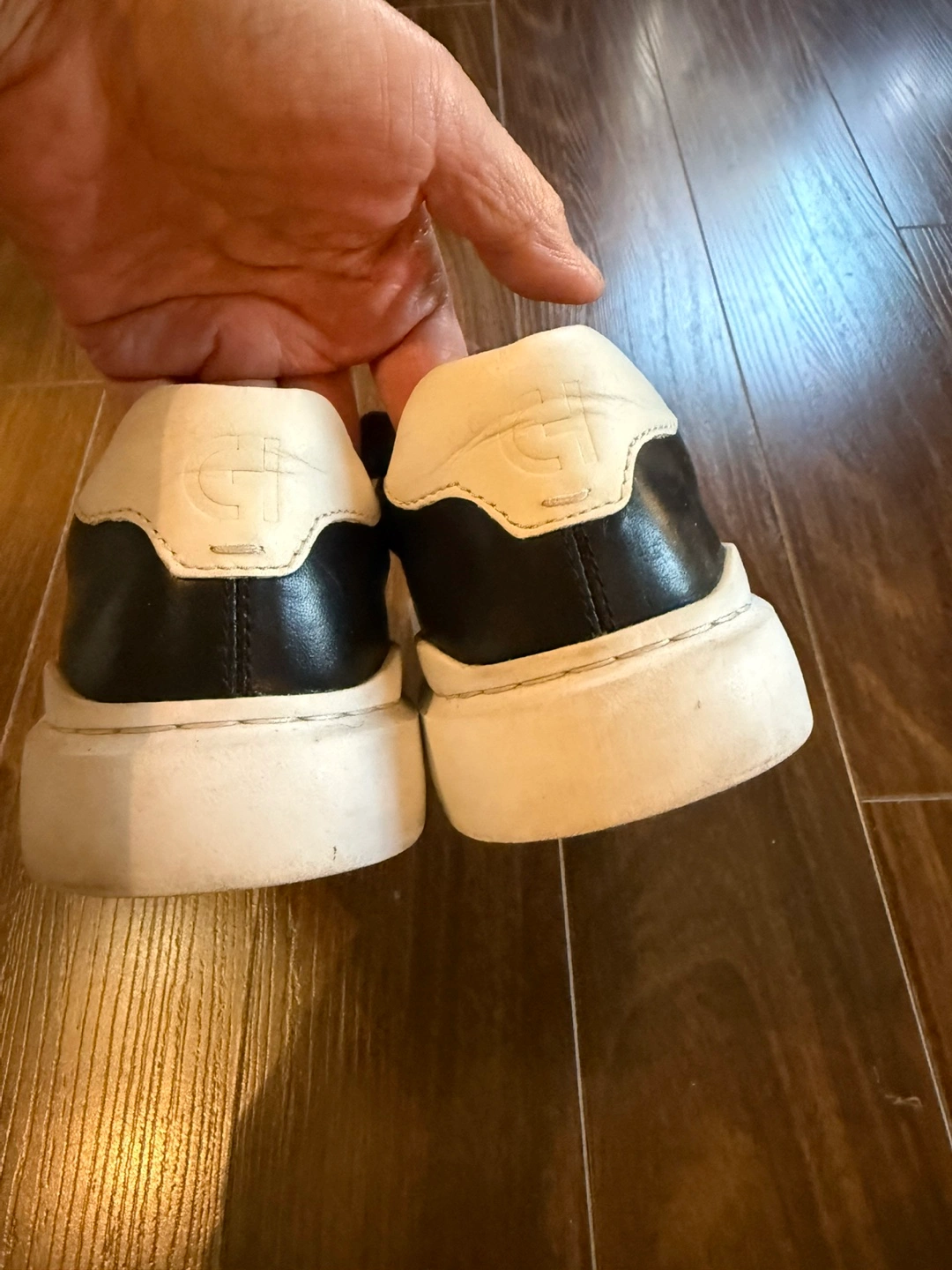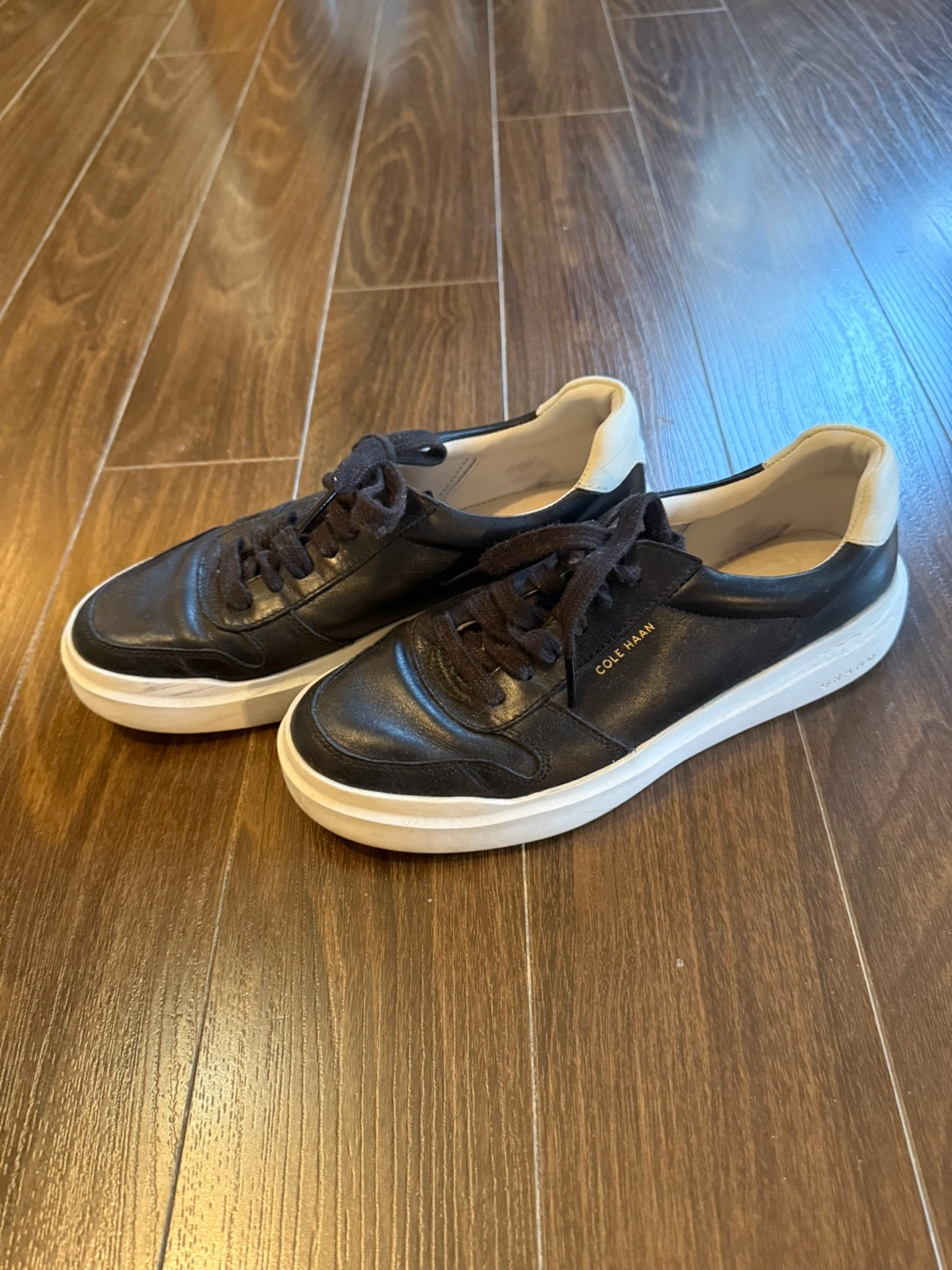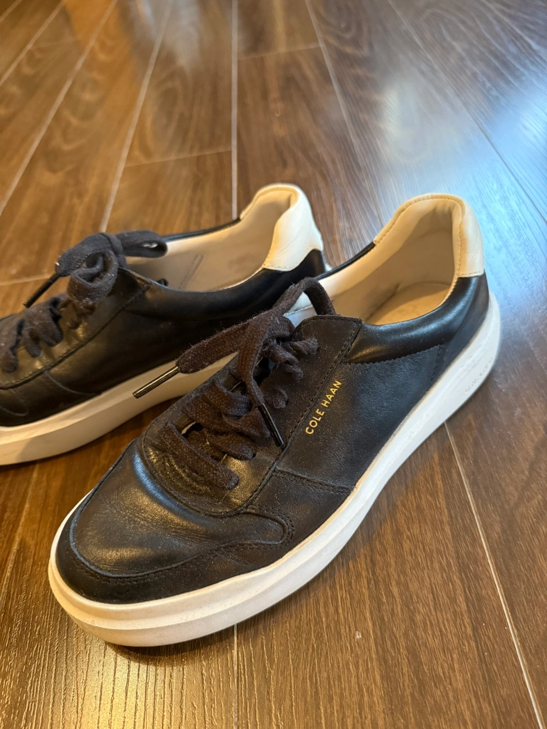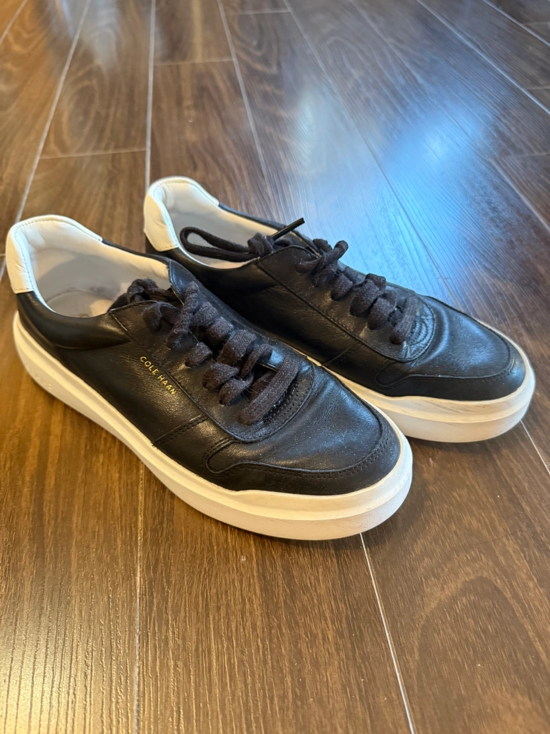 Pair of black leather sneakers. White soles and laces. Very good condition. I got it for my daughter, she has wide feet, wore these only a few times.