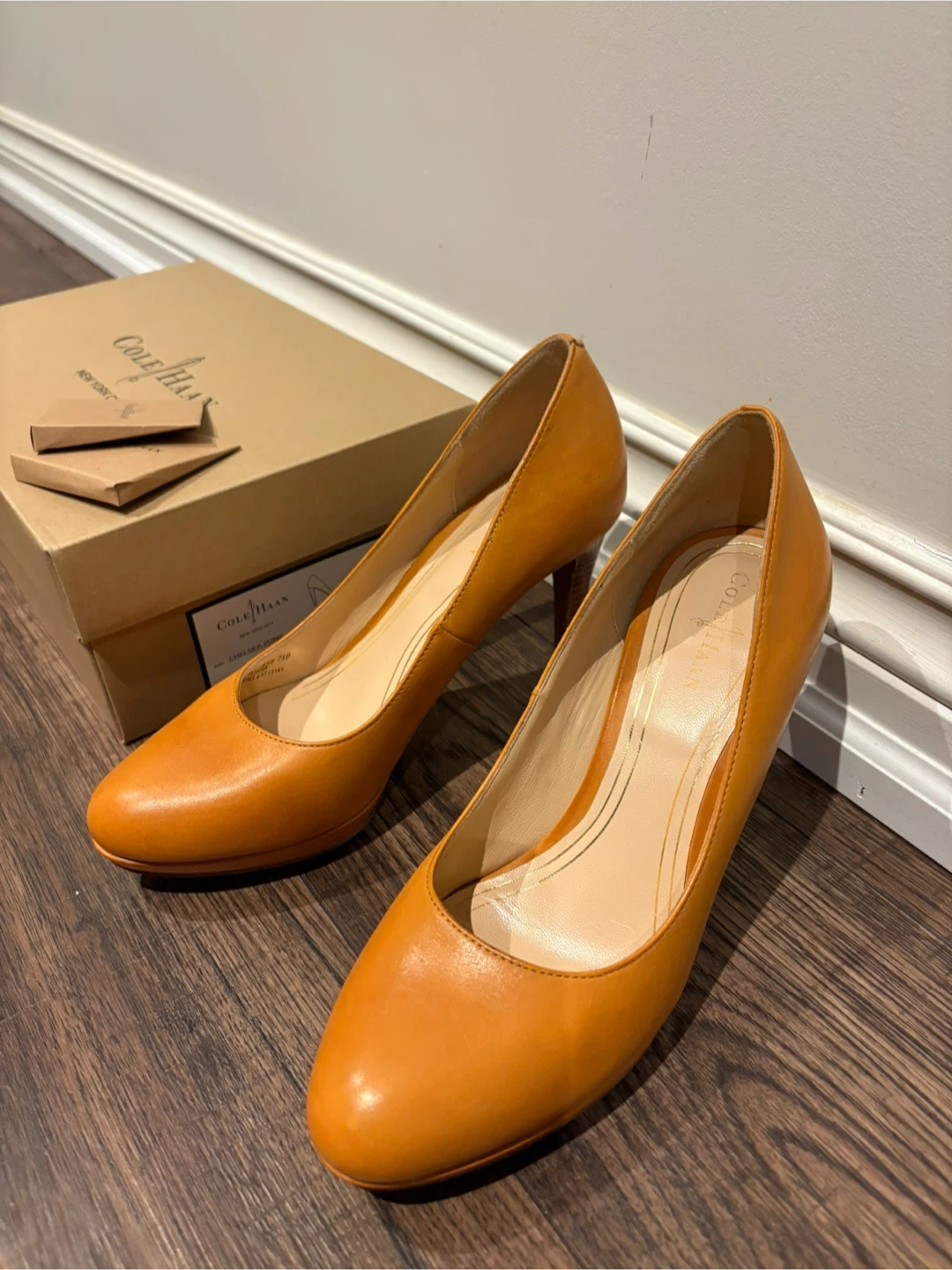 Cole Haan Chelsea pumps in a lovely citrine colour. They are size 7.5B and come with the original box. These stylish heels are perfect for adding a pop of colour to your outfit! With Nike air cushion technology.