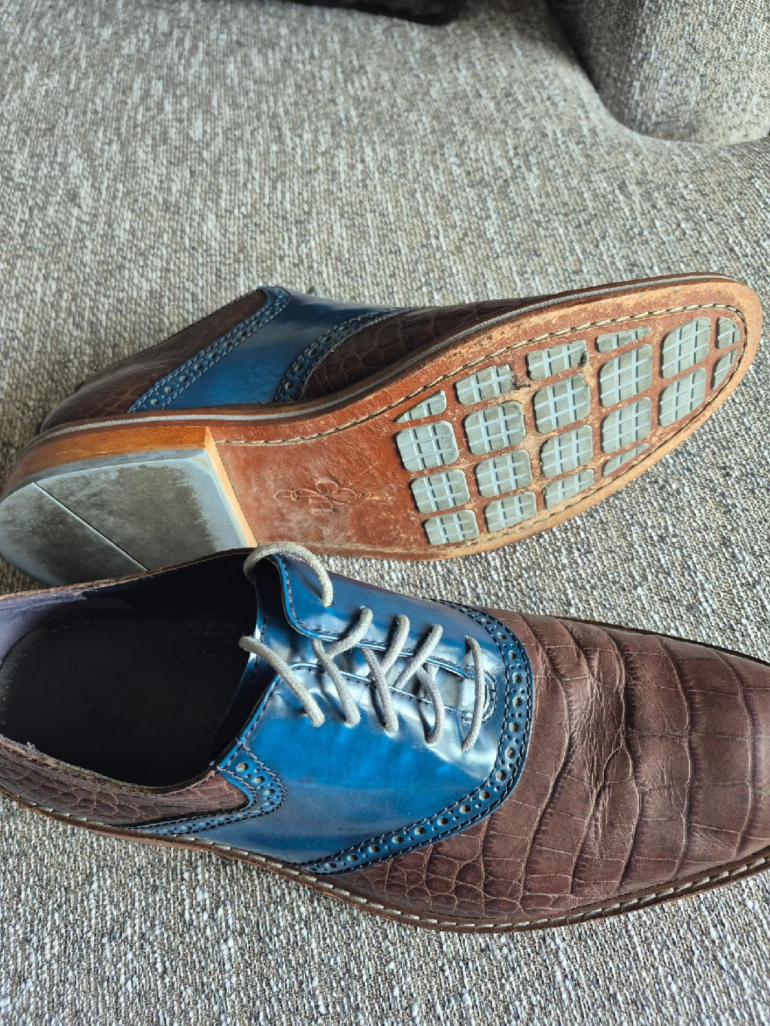 Selling a pair of Cole Haan men's dress shoes, size 11M. They feature a unique design with brown, crocodile-textured leather and blue accents. Perfect for adding a touch of style to your wardrobe! See last picture for a price comparison New and you will see my price is over 80% Off!! Curbside pickup M-Sat 5pm-9pm Or Delivery within London for an extra $5!!