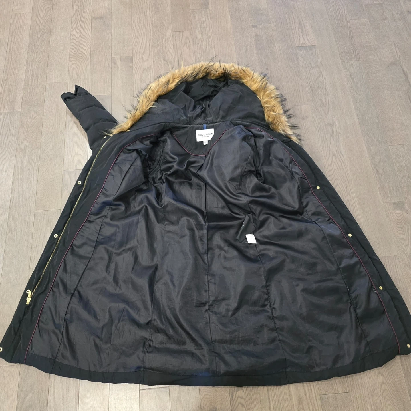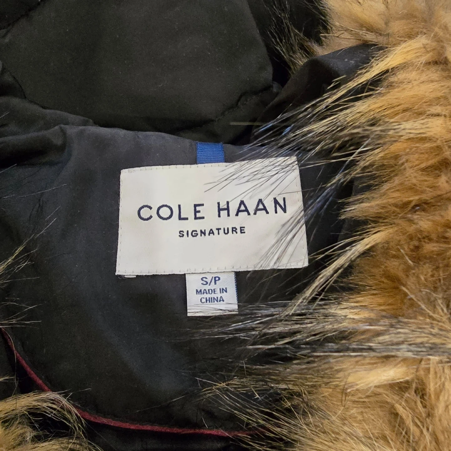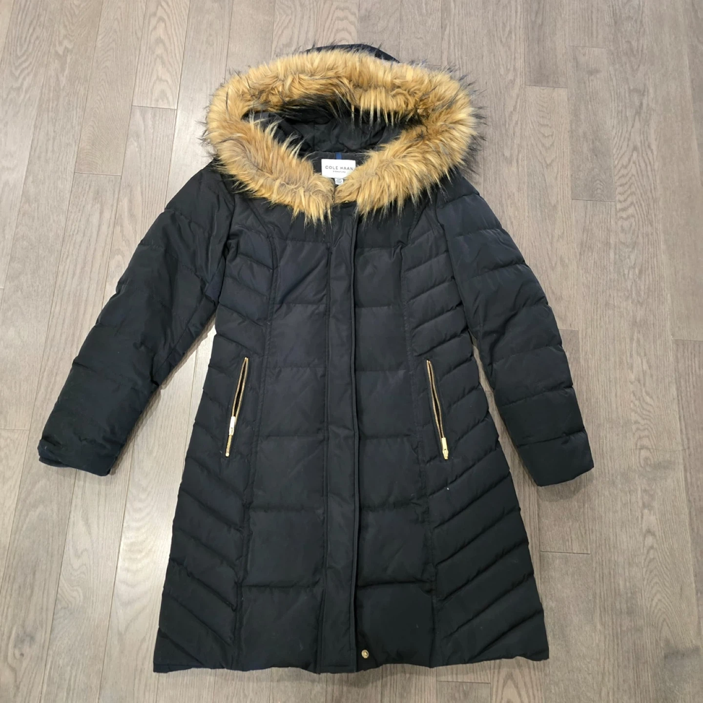 Cozy Cole Haan black down puffer coat with a faux fur-trimmed hood! It's in great condition and perfect for staying warm this winter. - Brand: Cole Haan - Size: Small - Colour: Black - Material: Down fill 80% new In great condition, minor worn Just a note: 2 inner seams are a bit torn, but you can easily stitch them back. (Please see photo.) Faux fur cannot be removed Orginal price: cad80+