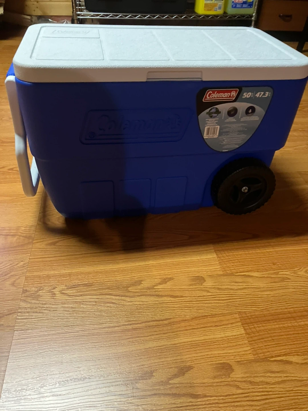 Selling a Coleman 50QT rolling cooler in blue! It's in great shape and ready to keep your drinks and snacks cold on the go. Perfect for picnics, camping, or backyard BBQs