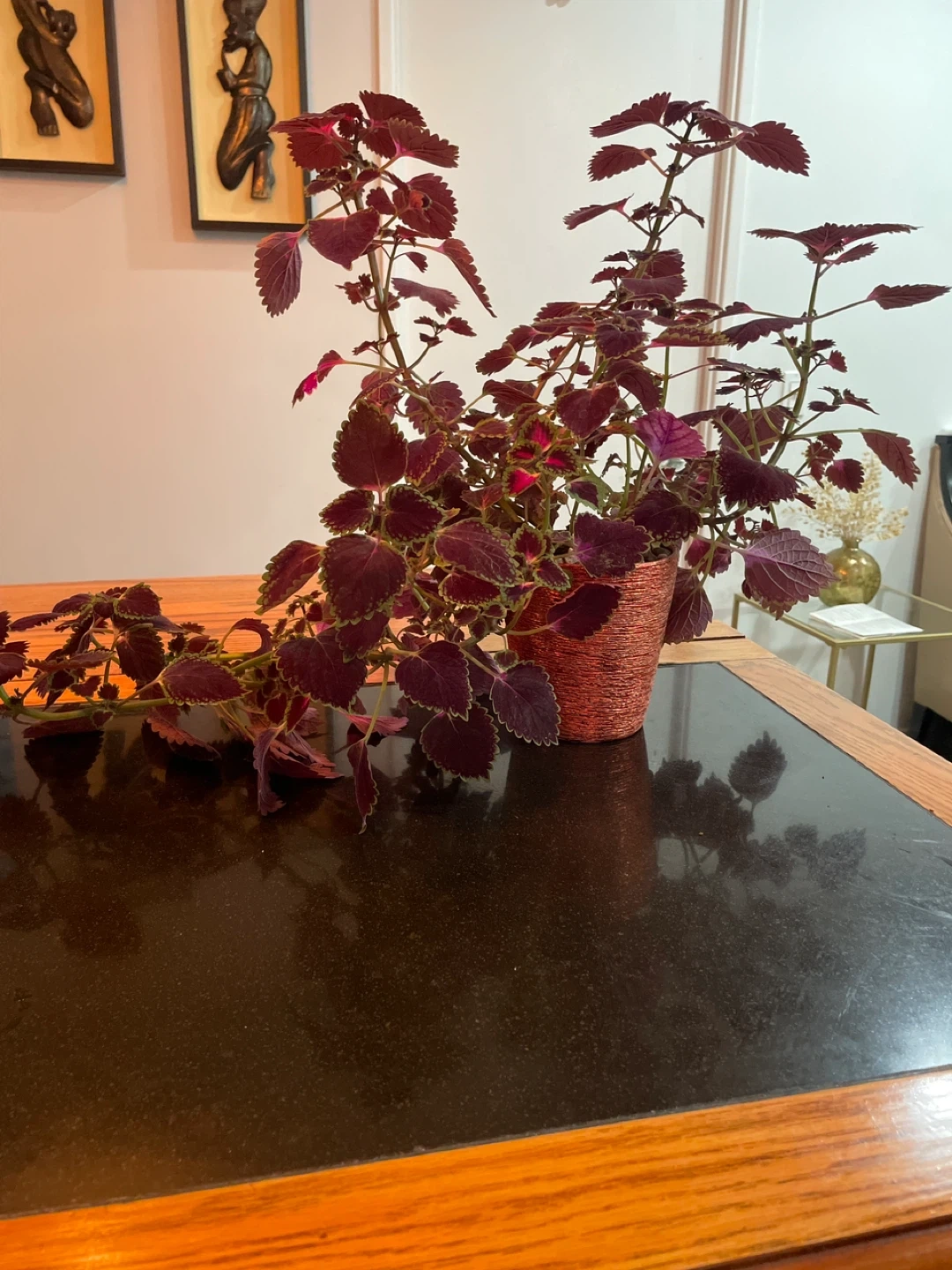 A beautiful coleus plant in a decorative pot! The leaves have a lovely mix of burgundy and green. It's a vibrant addition to any indoor space and easy to care for