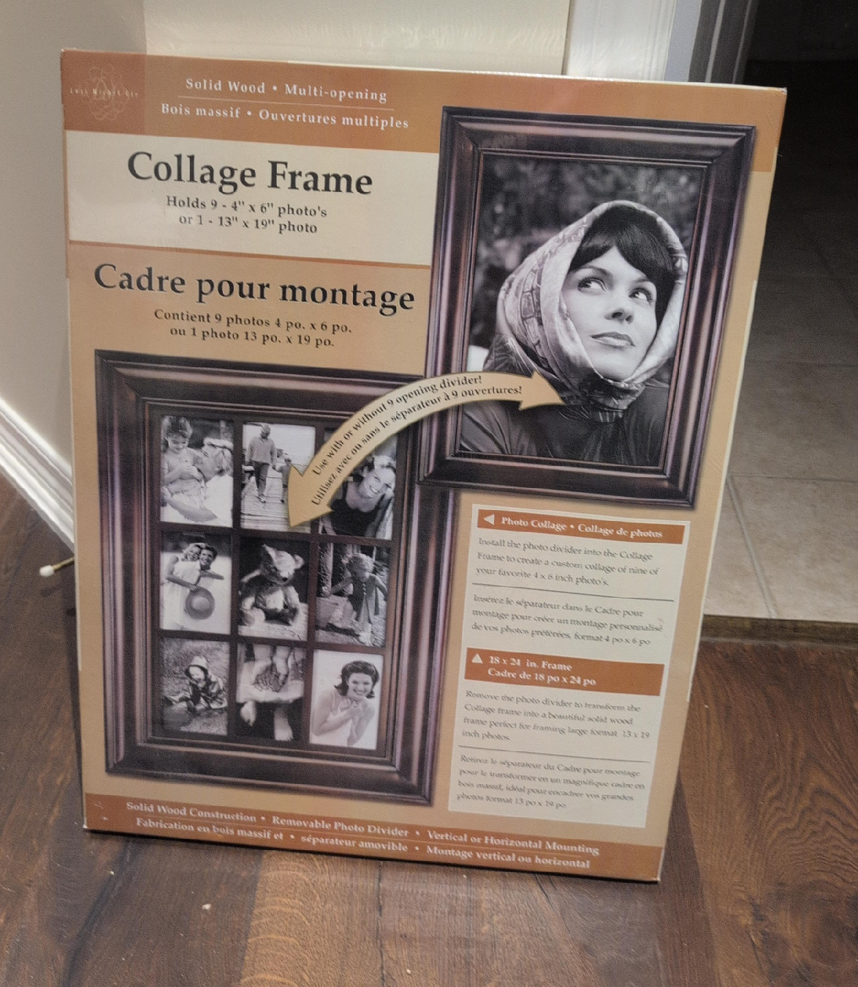 Selling a collage frame that holds 9 4" x 6" photos or 1 13" x 19" photo! It's a solid wood construction with a removable photo divider. You can mount it vertically or horizontally. Perfect for displaying your favourite memories