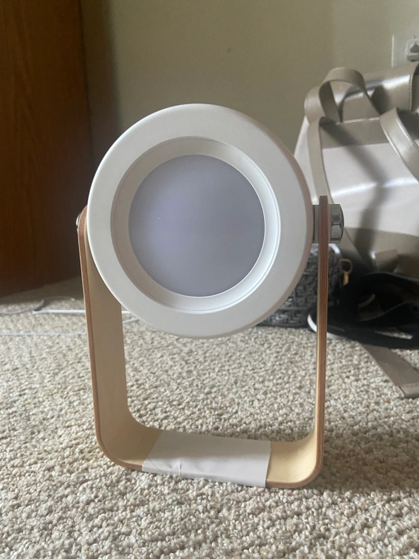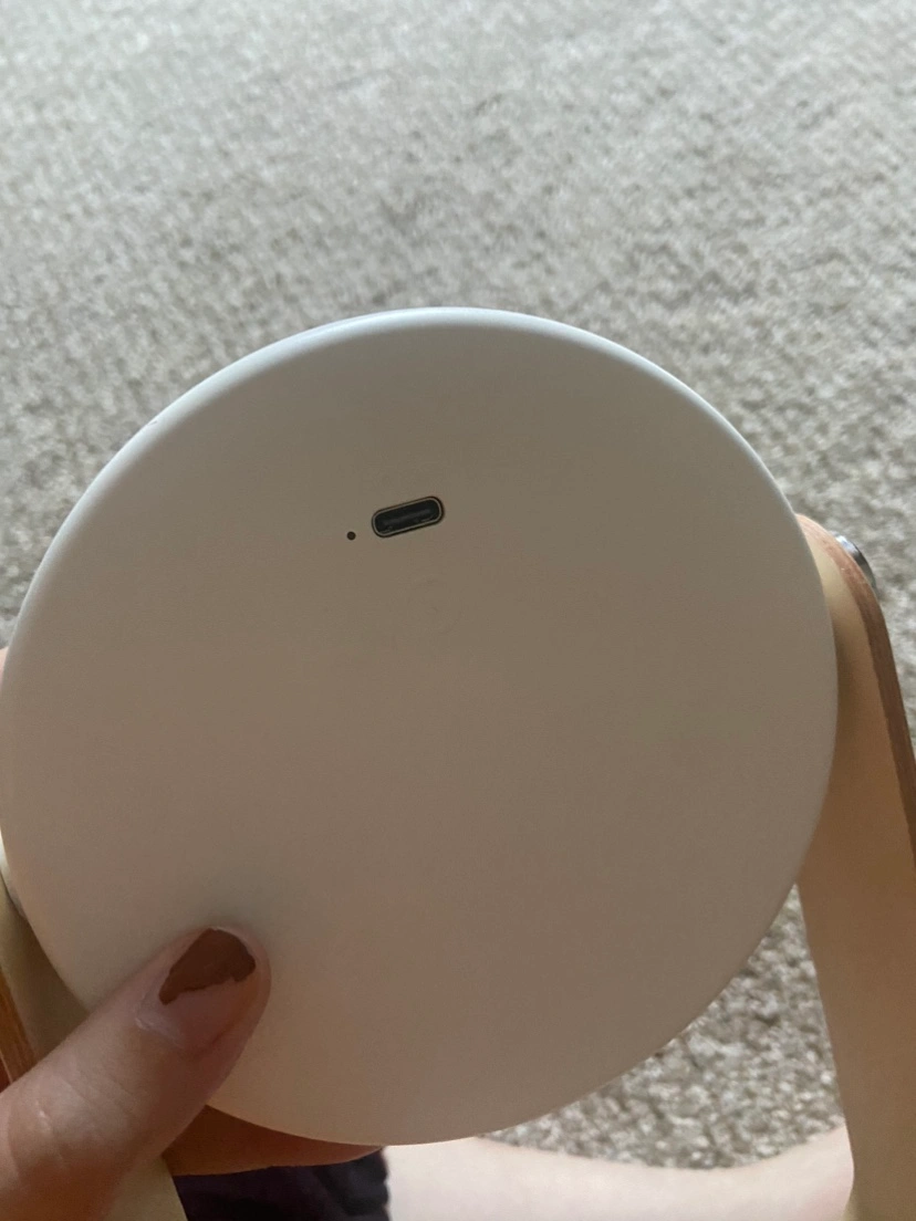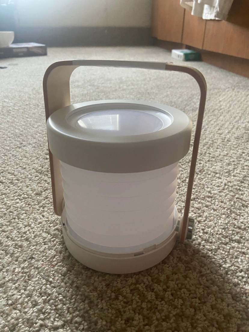Portable lamp with wooden handle and rechargeable battery. Works as a regular desk light or as a lantern night light. Comes with 3 levels of brightness. Warm orange light for cozy atmosphere