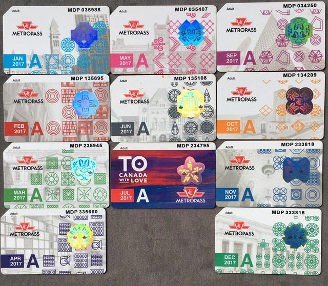 Collectible TTC monthly adult metro passes 2017 (missing just August). Selling price: $30