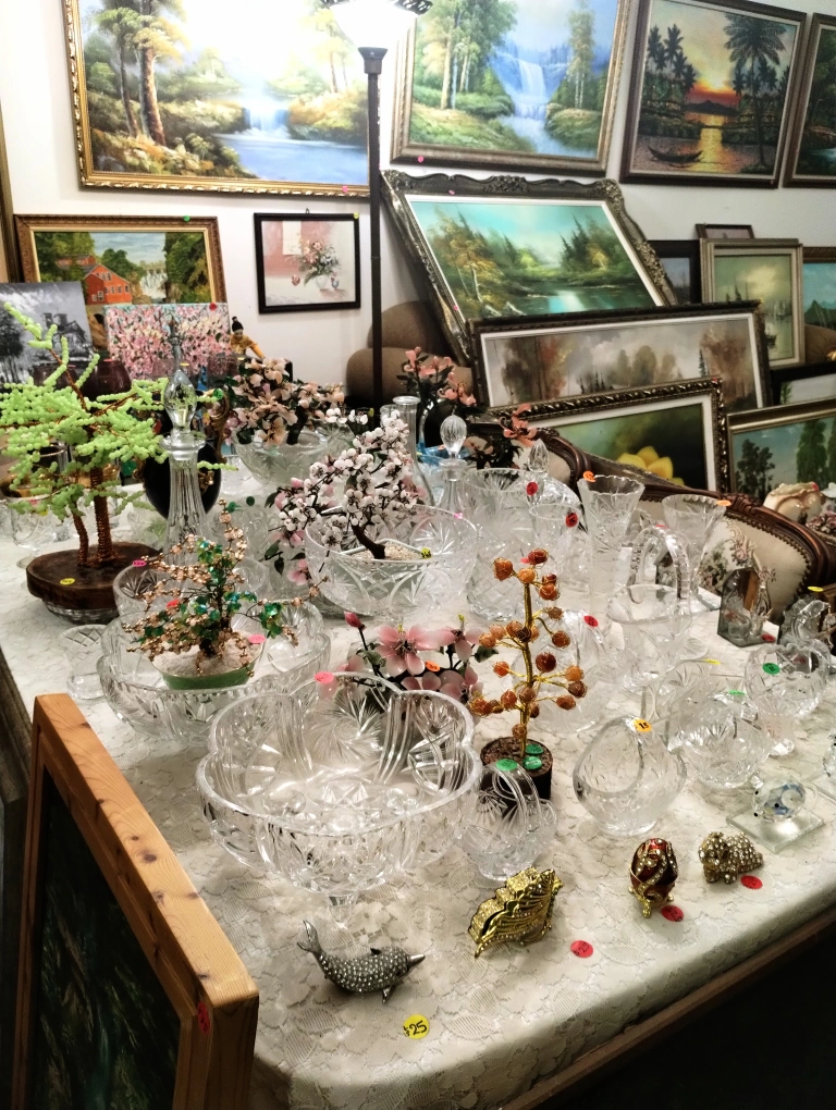 Assortment of crystal bowls, decorative trees, and figurines. Various sizes and styles. Perfect for collectors or home décor. Starting from $5 each.