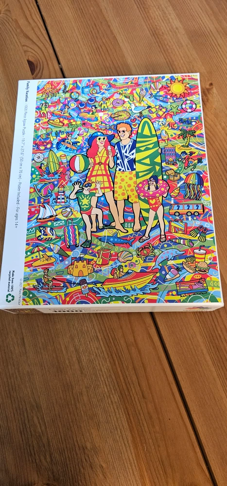 1000-piece jigsaw puzzle. Colourful beach scene. Family vacation theme. Suitable for ages 12+. Perfect condition.
