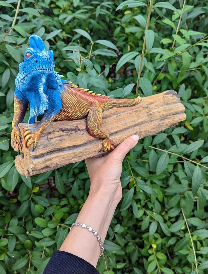 He's so cute! Vibrant and detailed iguana sculpture perched on a real driftwood base. Hand-painted in tropical shades of blue, orange.