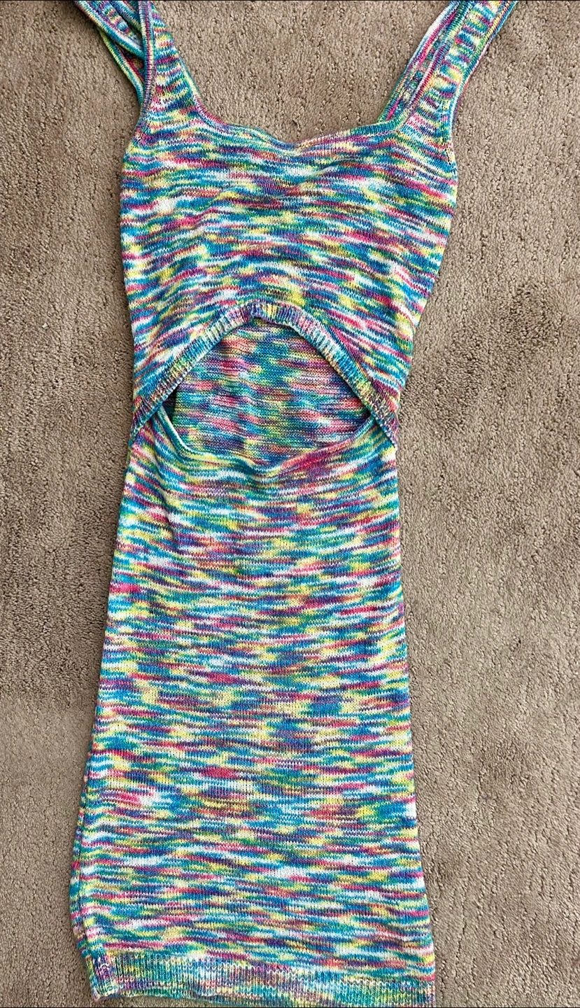 This is a cute and colourful knit mini dress! It features a cutout in the front. Perfect for summer!
