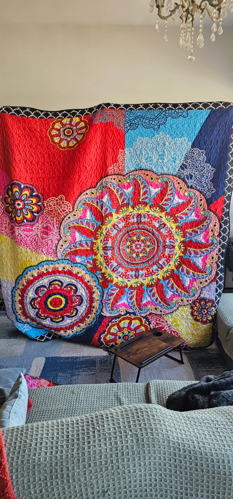 Selling a vibrant and cozy quilted throw blanket! It features a colourful paisley pattern with a black and white geometric border. Perfect for adding a pop of colour to your home or keeping warm on chilly evenings with two pillow cases.
