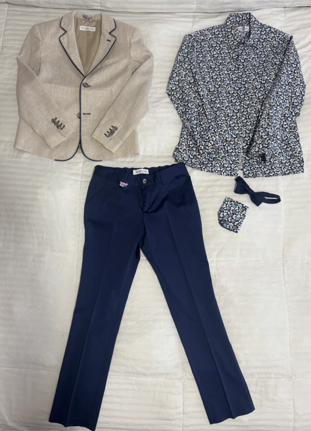 Used once Colorichiari boys suit in size 34 (kids 7-8) It includes a blazer, a patterned shirt, navy blue pants, a bow tie, and a pocket square. Perfect for a communion or any special occasion!