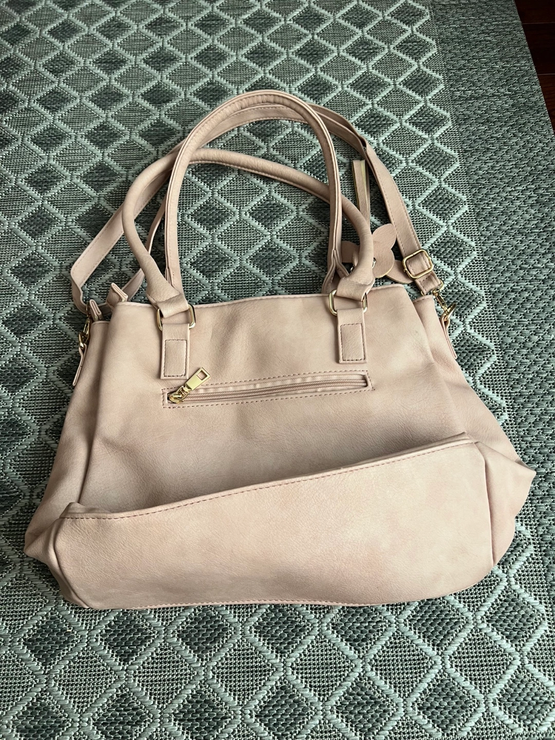 This satchel bag is in great condition and features a lovely colour block design in shades of pink, grey, and beige. It has both handles and a shoulder strap for versatile carrying options. The bag has a cute flower charm and multiple zippered compartments inside to keep your belongings organized. Zippers, handles, strap & the whole bag made up of quality material and workmanship. Cleaned & Washed professionally.