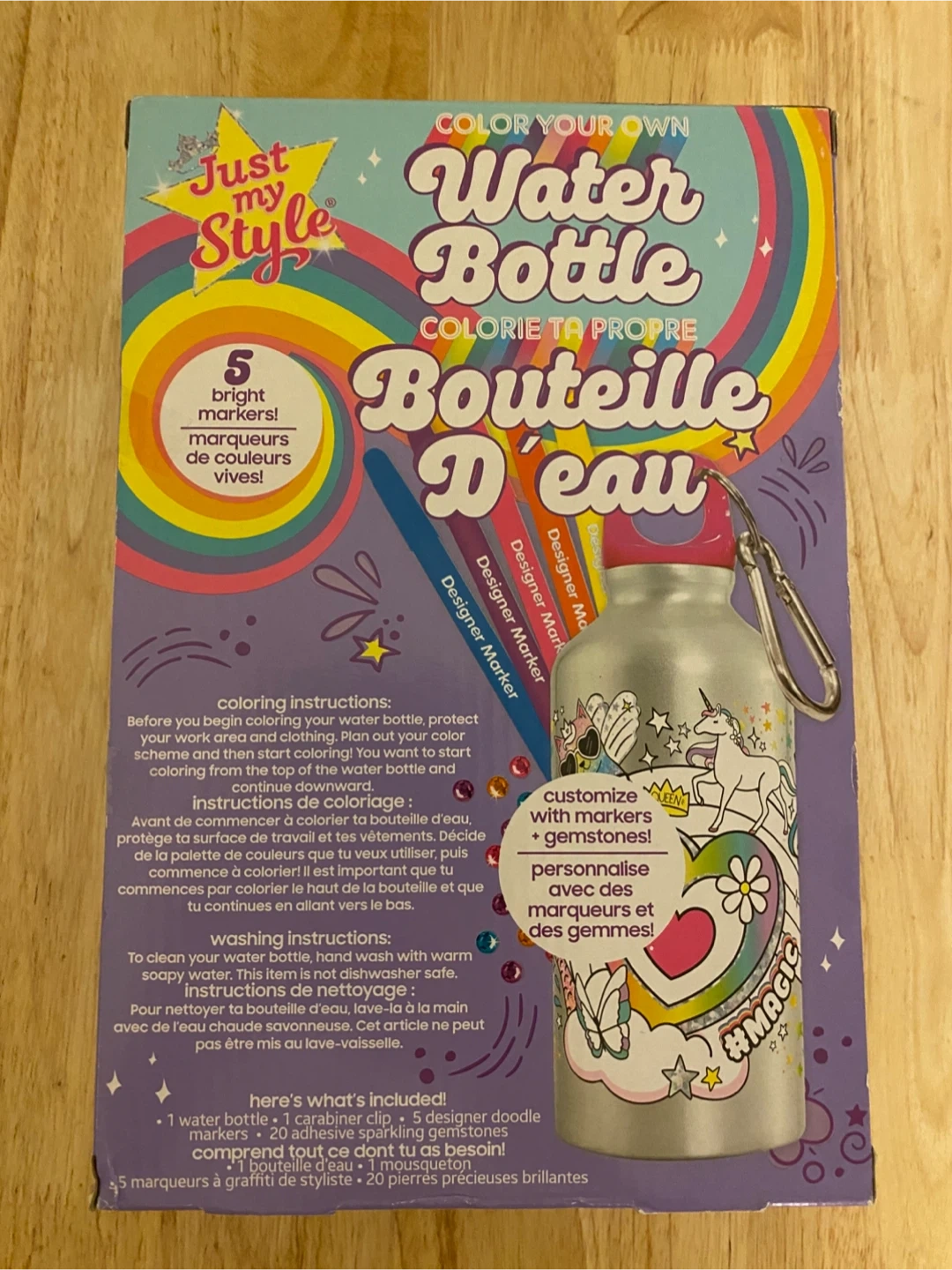 Get creative with this 'Just My Style' water bottle set! The set includes everything you need to personalize your own water bottle: - 1 water bottle - 1 carabiner clip - 5 designer doodle markers - 20 adhesive sparkling gemstones It's a fun and engaging activity for kids! New, in sealed box.
